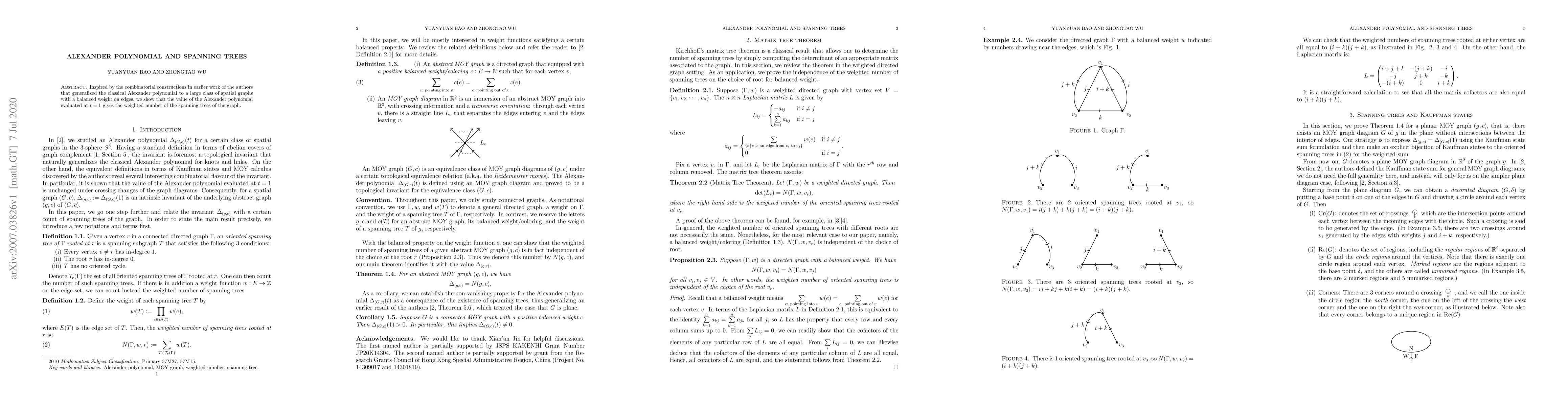 This paper generalizes the Alexander polynomial to spatial graphs and demonstrates that evaluating it at $t=1$ yields the weighted count of spanning trees in the graph. This provides a new combinatorial interpretation of the Alexander polynomial.