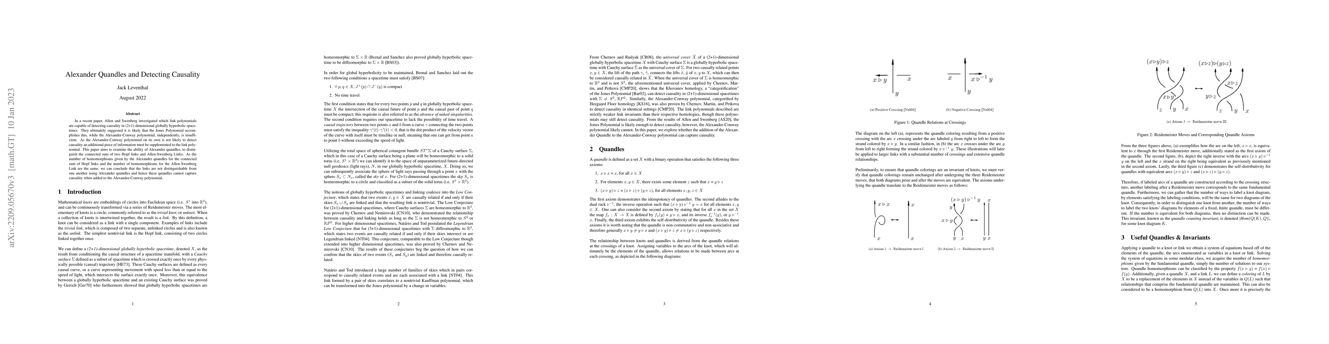 This paper explores whether Alexander quandles can distinguish between the connected sum of two Hopf links and Allen-Swenberg Links, finding they cannot. It concludes that Alexander quandles, when added to the Alexander-Conway polynomial, do not capture causality in (2+1)-dimensional globally hyperbolic spacetimes.