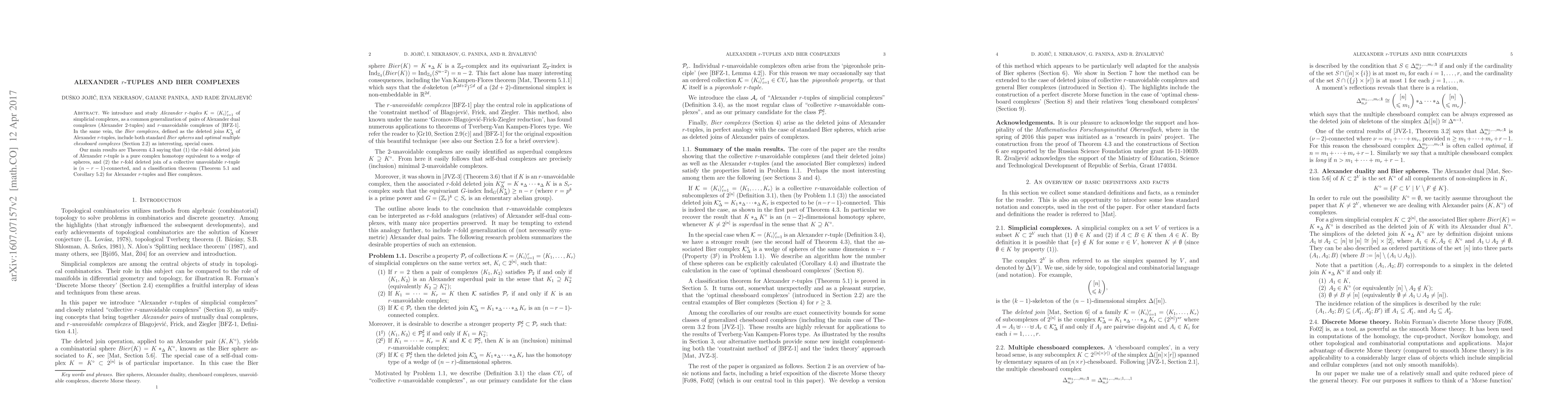Alexander $r$-tuples are introduced as a common generalization of pairs of Alexander dual complexes (Alexander $2$-tuples) and $r$-unavoidable complexes of Blagojevi\'{c}, Frick and Ziegler. The associated "Bier complexes" include both the Bier spheres and "optimal multiple chessboard complexes" as interesting, special cases. Our main result is Theorem 4.3 saying that (1) the $r$-fold deleted join of Alexander $r$-tuple is a pure complex homotopy equivalent to a wedge of spheres, and (2) the $r$-fold deleted join of a collectively unavoidable $r$-tuple is $(n-r-1)$-connected. We also give a complete classification (Theorem 5.1 and Corollary 5.2) of Alexander $r$-tuples and Bier complexes.