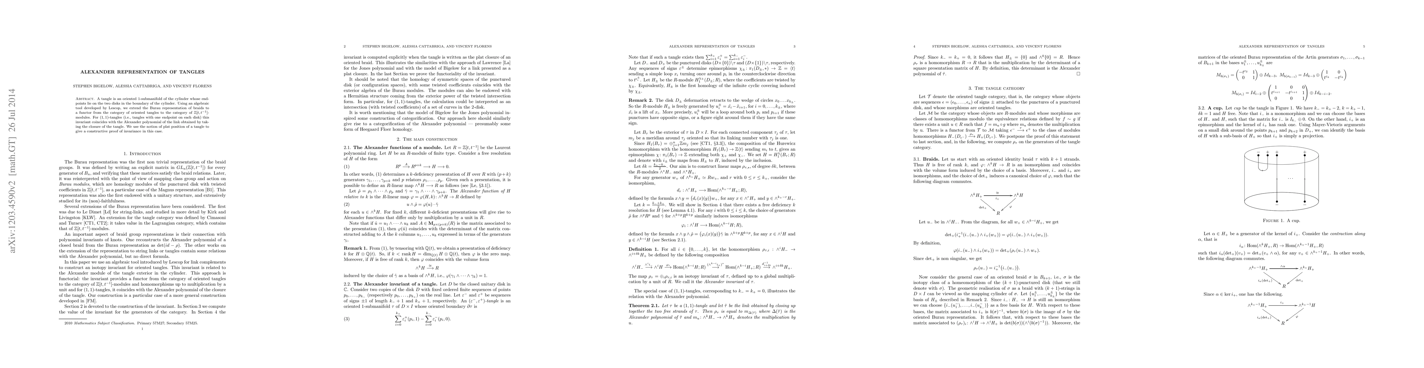 The paper extends the Burau representation for braids to tangles using Lescop's algebraic tool, establishing a functor from oriented tangles to Z[t,t^{-1}]-modules. For (1,1)-tangles, this representation coincides with the Alexander polynomial of the closed link, proved through the concept of plat position.