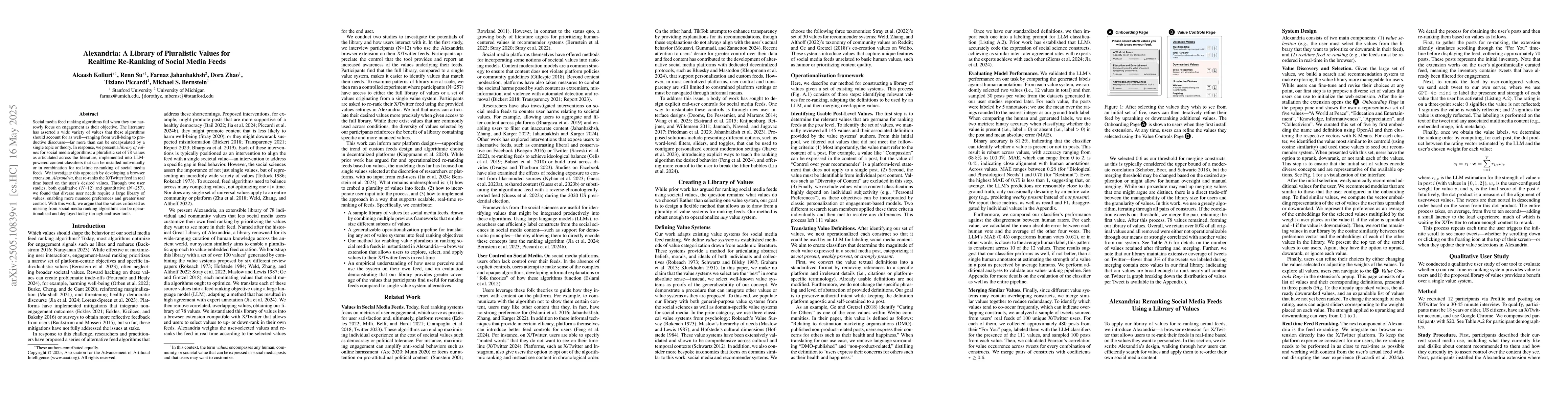 The development of Alexandria, a browser extension utilizing LLM-powered content classifiers to implement a pluralistic set of values for real-time re-ranking of social media feeds.