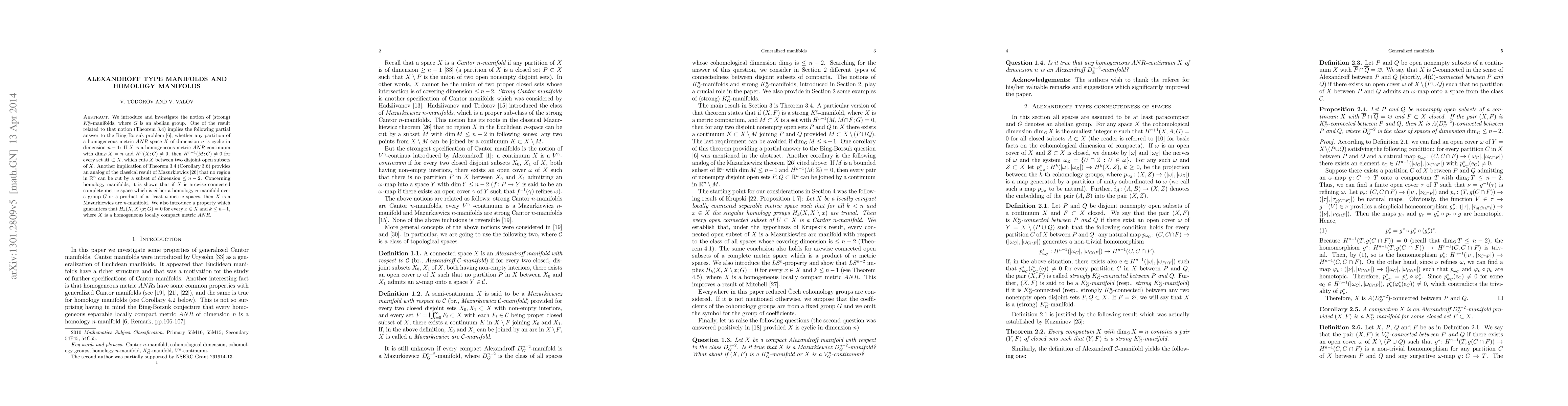 We introduce and investigate the notion of (strong) $K^n_G$-manifolds, where $G$ is an abelian group. One of the result related to that notion (Theorem 3.4) implies the following partial answer to the Bing-Borsuk problem \cite{bb}, whether any partition of a homogeneous metric $ANR$-space $X$ of dimension $n$ is cyclic in dimension $n-1$: If $X$ is a homogeneous metric $ANR$ compactum with $\check{H}^{n}(X;G)\neq 0$, then $\check{H}^{n-1}(M;G)\neq 0$ for every set $M\subset X$, which is cutting $X$ between two disjoint open subsets of $X$. Another implication of Theorem 3.4 (Corollary 3.6) provides an analog of the classical result of Mazurkiewicz \cite{ma} that no region in $\mathbb R^n$ can be cut by a subset of dimension $\leq n-2$. Concerning homology manifolds, it is shown that if $X$ is arcwise connected complete metric space which is either a homology $n$-manifold over a group $G$ or a product of at least $n$ metric spaces, then $X$ is a Mazurkiewicz arc $n$-manifold. We also introduce a property which guarantees that $H_k(X,X\setminus x;G)=0$ for every $x\in X$ and $k\leq n-1$, where $X$ is a homogeneous locally compact metric $ANR$.