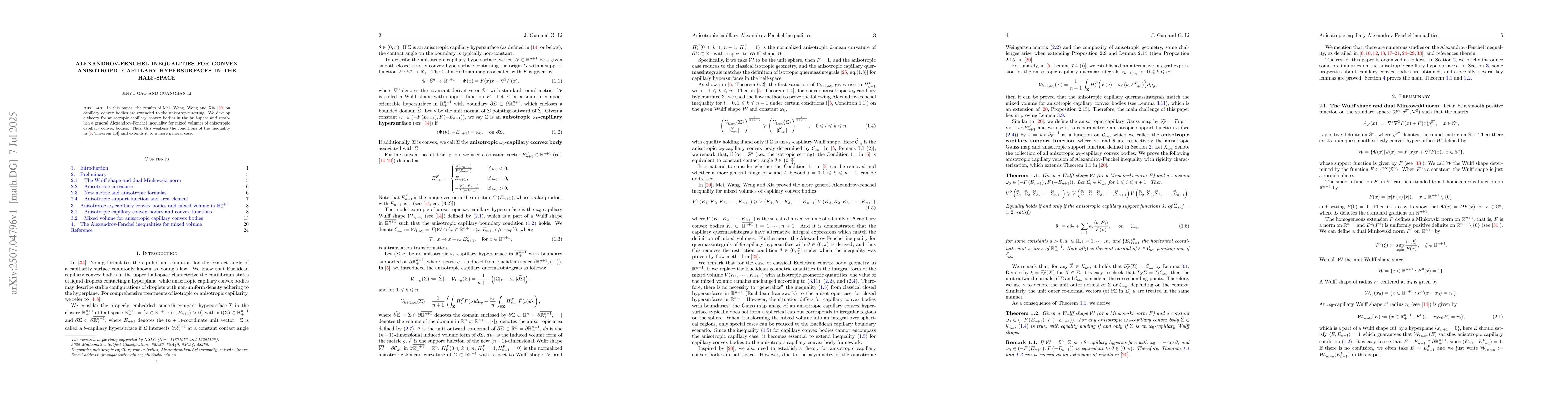 In this paper, the results of Mei, Wang, Weng and Xia [Math. Z., 2025, MR4911815] on capillary convex bodies are extended to the anisotropic setting. We develop a theory for anisotropic capillary convex bodies in the half-space and establish a general Alexandrov-Fenchel inequality for mixed volumes of anisotropic capillary convex bodies. Thus, this weakens the conditions of the inequality in [Ding-Gao-Li,arXiv:2408.10740, Theorem 1.4] and extends it to a more general case.