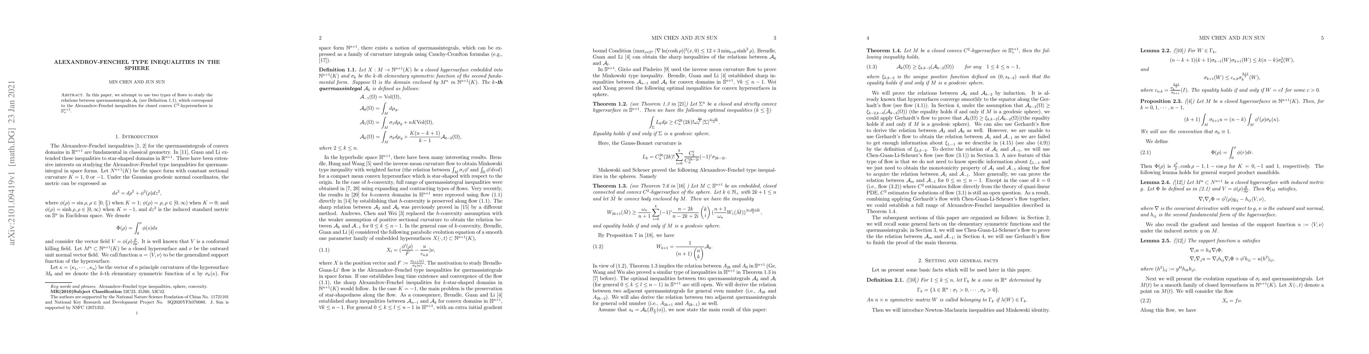 In this paper, we attempt to use two types of flows to study the relations between quermassintegrals $\mathcal{A}_k$ (see Definition 1.1), which correspond to the Alexandrov-Fenchel inequalities for closed convex $C^2$-hypersurfaces in $\mathbb{S}_+^{n+1}.$