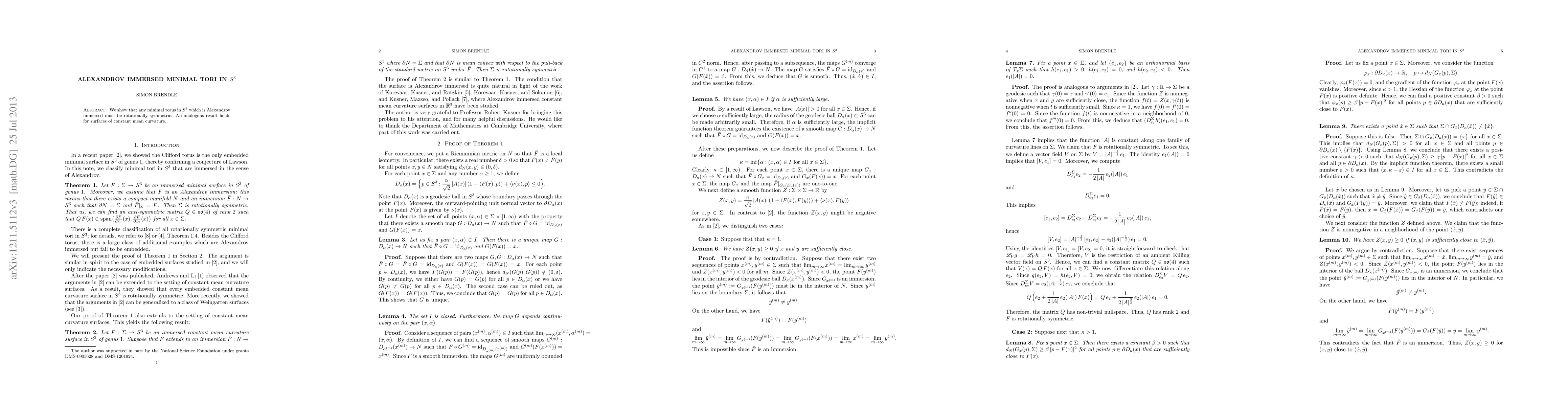 Summary: This paper demonstrates that any minimal torus immersed in $S^3$ under Alexandrov's conditions is rotationally symmetric, with a parallel finding for surfaces of constant mean curvature.