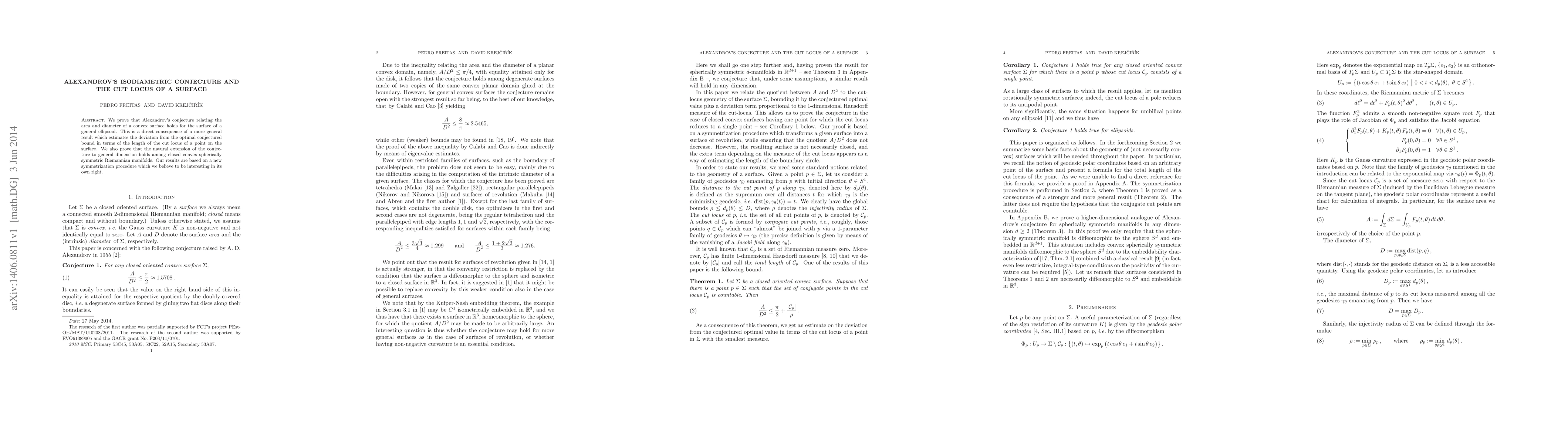 We prove that Alexandrov's conjecture relating the area and diameter of a convex surface holds for the surface of a general ellipsoid. This is a direct consequence of a more general result which estimates the deviation from the optimal conjectured bound in terms of the length of the cut locus of a point on the surface. We also prove that the natural extension of the conjecture to general dimension holds among closed convex spherically symmetric Riemannian manifolds. Our results are based on a new symmetrization procedure which we believe to be interesting in its own right.
