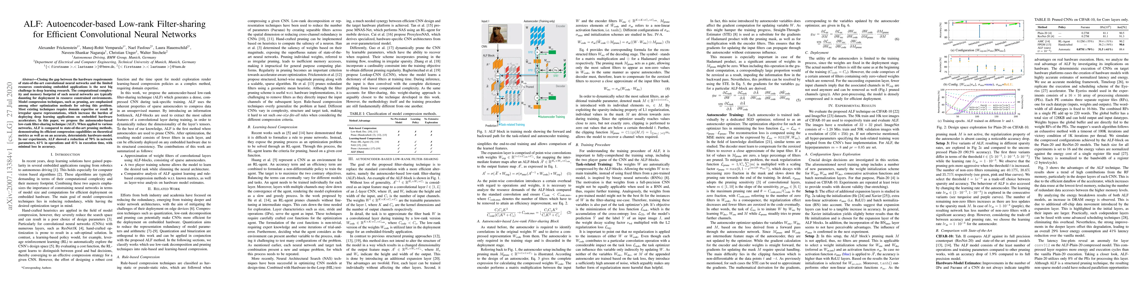Closing the gap between the hardware requirements of state-of-the-art convolutional neural networks and the limited resources constraining embedded applications is the next big challenge in deep learning research. The computational complexity and memory footprint of such neural networks are typically daunting for deployment in resource constrained environments. Model compression techniques, such as pruning, are emphasized among other optimization methods for solving this problem. Most existing techniques require domain expertise or result in irregular sparse representations, which increase the burden of deploying deep learning applications on embedded hardware accelerators. In this paper, we propose the autoencoder-based low-rank filter-sharing technique technique (ALF). When applied to various networks, ALF is compared to state-of-the-art pruning methods, demonstrating its efficient compression capabilities on theoretical metrics as well as on an accurate, deterministic hardware-model. In our experiments, ALF showed a reduction of 70\% in network parameters, 61\% in operations and 41\% in execution time, with minimal loss in accuracy.
