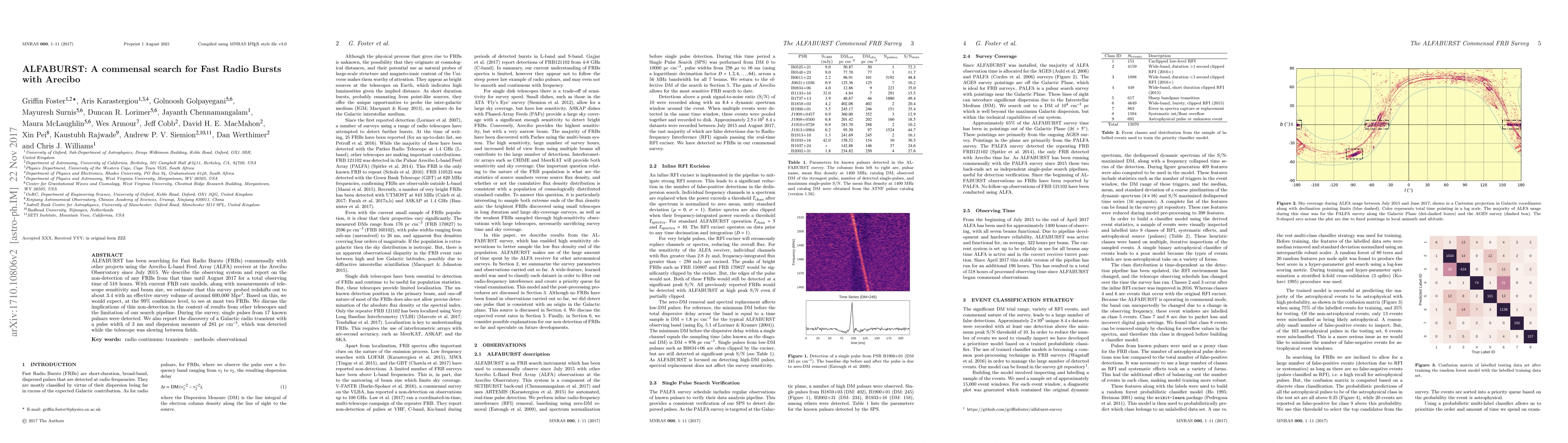 ALFABURST, using Arecibo's ALFA receiver, surveyed for Fast Radio Bursts (FRBs) for 518 hours from July 2015 to August 2017 without detection, estimating a probed redshift range of up to 3.4. The study also discovered a 3 ms Galactic radio transient during telescope slewing.