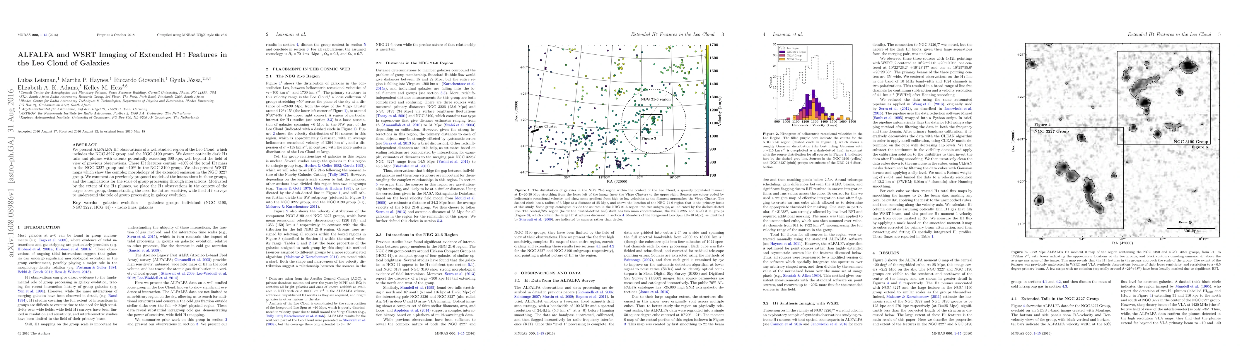 This paper reports ALFALFA HI observations revealing extended HI tails and plumes in the Leo Cloud, extending over 600 kpc and comprising about 40% of the NGC 3227 group's HI mass and 10% of the NGC 3190 group's. WSRT imaging highlights the complex morphology in NGC 3227, suggesting the need for broader HI surveys to understand group interactions' role in galaxy evolution.