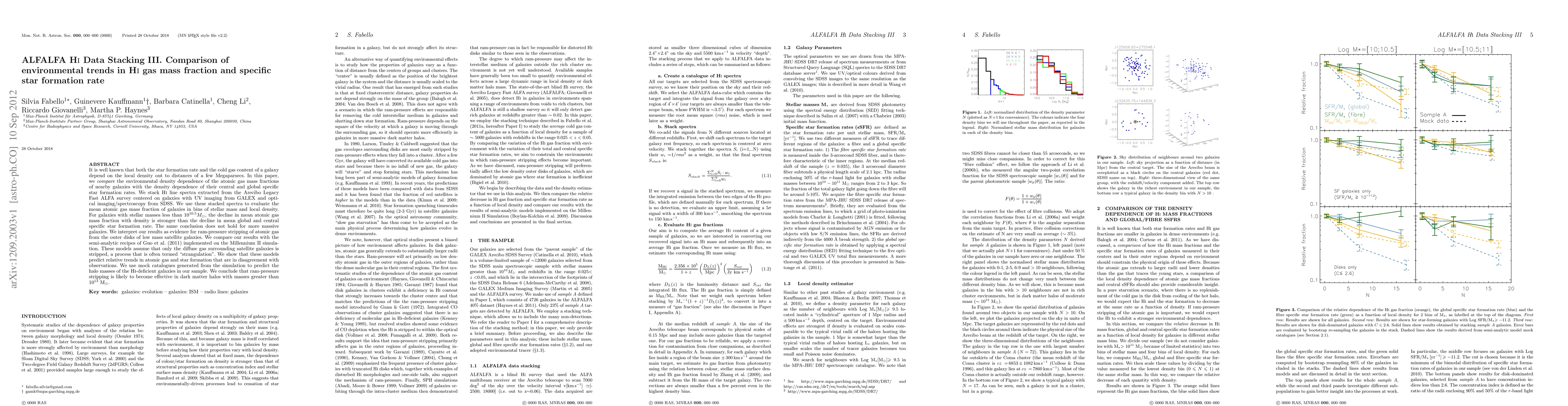 It is well known that both the star formation rate and the cold gas content of a galaxy depend on the local density out to distances of a few Megaparsecs. In this paper, we compare the environmental density dependence of the atomic gas mass fractions of nearby galaxies with the density dependence of their central and global specific star formation rates. We stack HI line spectra extracted from the Arecibo Legacy Fast ALFA survey centered on galaxies with UV imaging from GALEX and optical imaging/spectroscopy from SDSS. We use these stacked spectra to evaluate the mean atomic gas mass fraction of galaxies in bins of stellar mass and local density. For galaxies with stellar masses less than 10^10.5 M_sun, the decline in mean atomic gas mass fraction with density is stronger than the decline in mean global and central specific star formation rate. The same conclusion does not hold for more massive galaxies. We interpret our results as evidence for ram-pressure stripping of atomic gas from the outer disks of low mass satellite galaxies. We compare our results with the semi-analytic recipes of Guo et al. (2011) implemented on the Millennium II simulation. These models assume that only the diffuse gas surrounding satellite galaxies is stripped, a process that is often termed "strangulation". We show that these models predict relative trends in atomic gas and star formation that are in disagreement with observations. We use mock catalogues generated from the simulation to predict the halo masses of the HI-deficient galaxies in our sample. We conclude that ram-pressure stripping is likely to become effective in dark matter halos with masses greater than 10^13 M_sun.