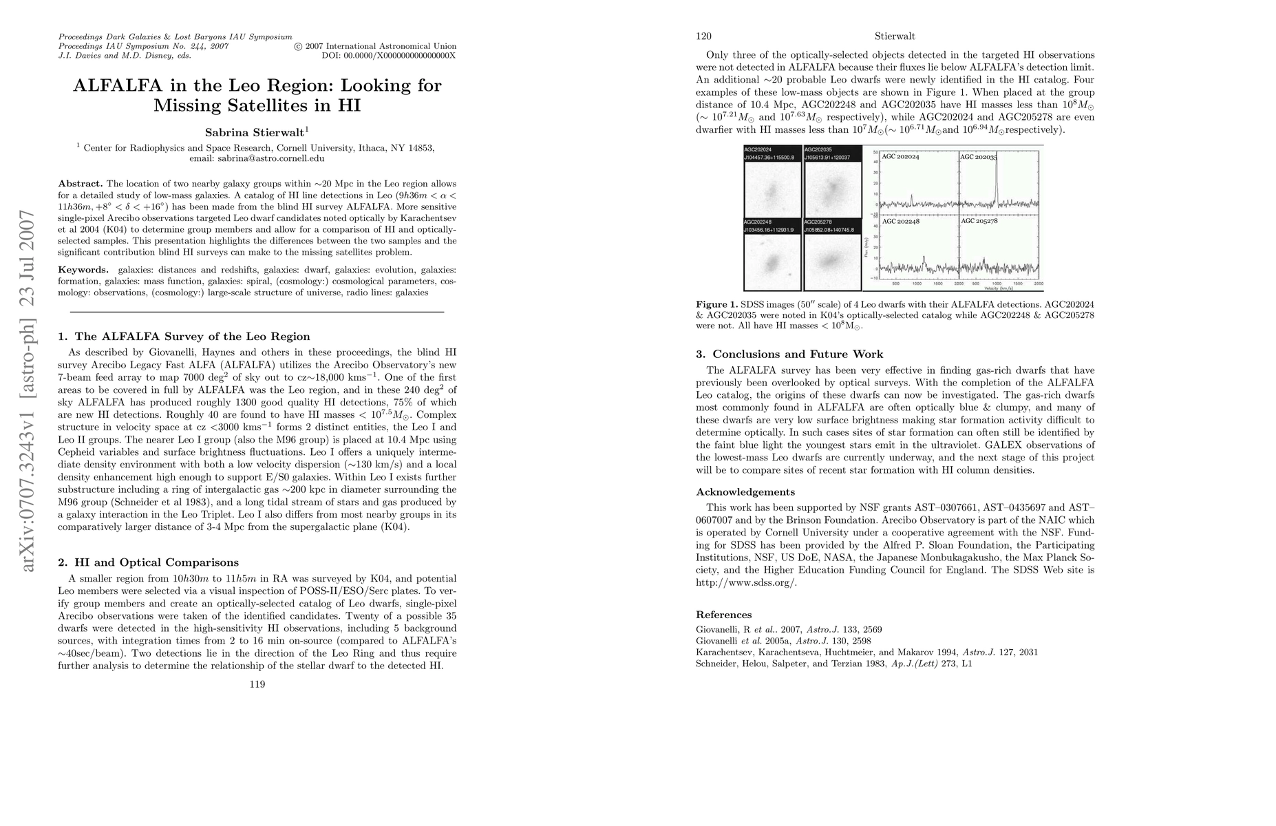 This study uses the ALFALFA HI survey to detect low-mass galaxies in the Leo region, identifying potential missing satellites. It compares HI-detected galaxies with optically-selected dwarf candidates, highlighting the significant role of HI surveys in addressing the missing satellites problem.