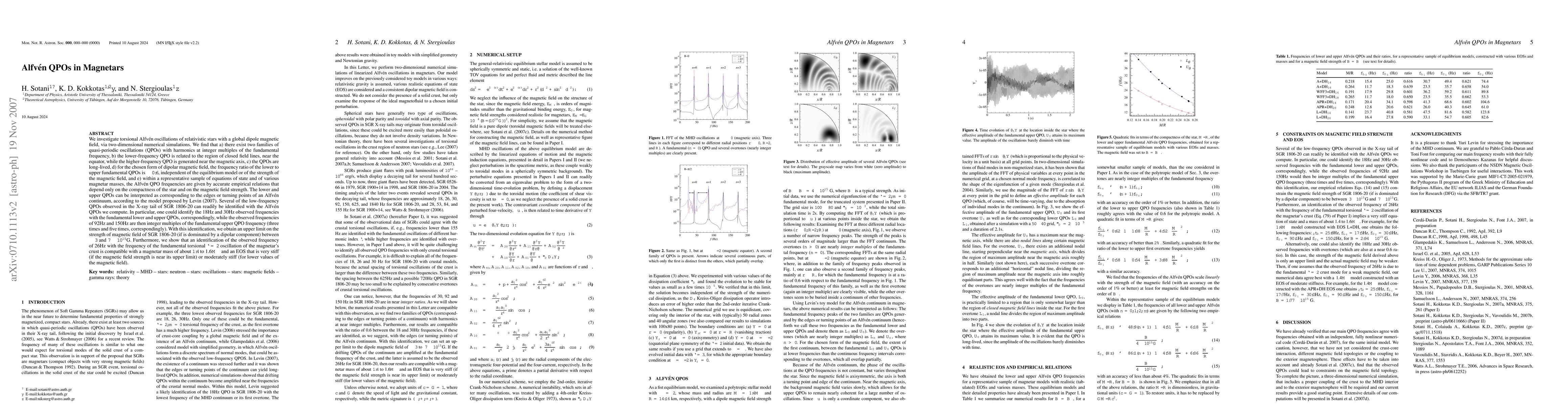 We investigate torsional Alfv\'en oscillations of relativistic stars with a global dipole magnetic field, via two-dimensional numerical simulations. We find that a) there exist two families of quasi-periodic oscillations (QPOs) with harmonics at integer multiples of the fundamental frequency, b) the lower-frequency QPO is related to the region of closed field lines, near the equator, while the higher-frequency QPO is generated near the magnetic axis, c) the QPOs are long-lived, d) for the chosen form of dipolar magnetic field, the frequency ratio of the lower to upper fundamental QPOs is ~0.6, independent of the equilibrium model or of the strength of the magnetic field, and e) within a representative sample of equations of state and of various magnetar masses, the Alfv\'en QPO frequencies are given by accurate empirical relations that depend only on the compactness of the star and on the magnetic field strength. The lower and upper QPOs can be interpreted as corresponding to the edges or turning points of an Alfv\'en continuum, according to the model proposed by Levin (2007). Several of the low-frequency QPOs observed in the X-ray tail of SGR 1806-20 can readily be identified with the Alfv\'en QPOs we compute. In particular, one could identify the 18Hz and 30Hz observed frequencies with the fundamental lower and upper QPOs, correspondingly, while the observed frequencies of 92Hz and 150Hz are then integer multiples of the fundamental upper QPO frequency (three times and five times, correspondingly). With this identification, we obtain an upper limit on the strength of magnetic field of SGR 1806-20 (if is dominated by a dipolar component) between ~3 and $7\times 10^{15}$G. Furthermore, we discuss the implications for the high-density EOS of compact stars. (Abridged)
