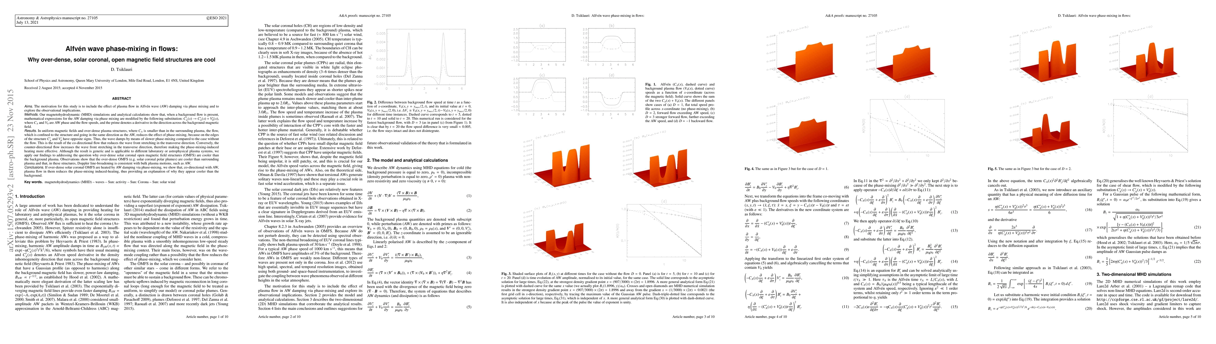The motivation for this study is to include the effect of plasma flow in Alfv\'en wave (AW) damping via phase mixing and to explore the observational implications. Our magnetohydrodynamic (MHD) simulations and analytical calculations show that, when a background flow is present, mathematical expressions for the AW damping via phase mixing are modified by the following substitution: $C_A^\prime(x) \to C_A^\prime(x)+V_0^\prime(x)$, where $C_A$ and $V_0$ are AW phase and the flow speeds, and the prime denotes a derivative in the direction across the background magnetic field. In uniform magnetic fields and over-dense plasma structures, where $C_A$ is smaller than in the surrounding plasma, the flow, which is confined to the structure and going in the same direction as the AW, reduces the effect of phase-mixing, because on the edges of the structure $C_A^\prime$ and $V_0^\prime$ have opposite signs. Thus, the wave damps by means of slower phase-mixing compared to the case without the flow. This is the result of the co-directional flow that reduces the wave front stretching in the transverse direction. We apply our findings to addressing the question why over-dense solar coronal open magnetic field structures (OMFS) are cooler than the background plasma. Observations show that the over-dense OMFS (e.g. solar coronal polar plumes) are cooler than surrounding plasma and that, in these structures, Doppler line-broadening is consistent with bulk plasma motions, such as AW. If over-dense solar coronal OMFS are heated by AW damping via phase-mixing, we show that, co-directional with AW, plasma flow in them reduces the phase-mixing induced-heating, thus providing an explanation of why they appear cooler than the background.