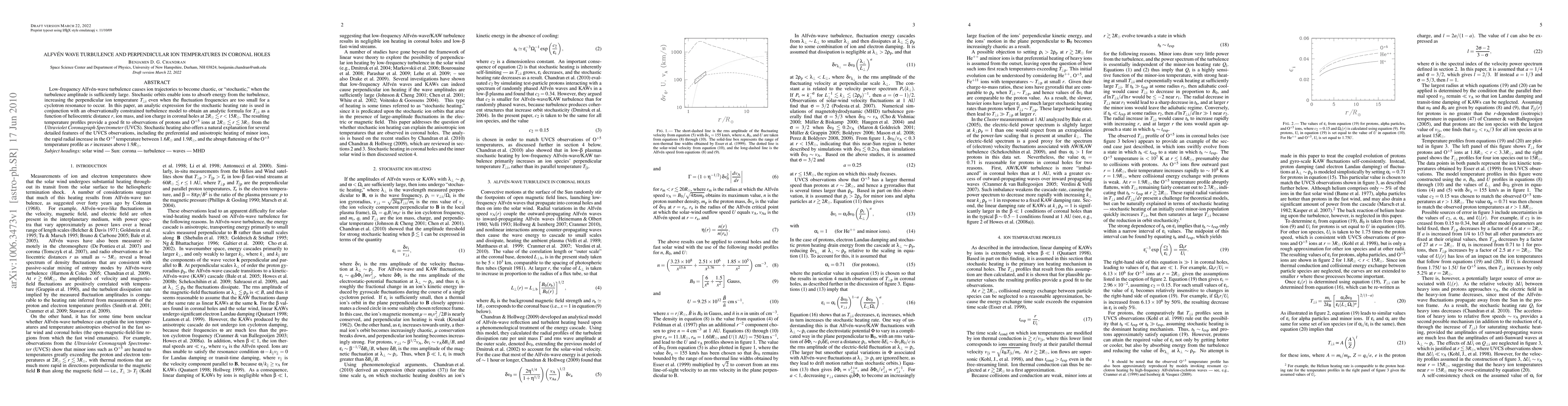 This paper investigates Alfven wave turbulence's role in increasing perpendicular ion temperatures in coronal holes through stochastic heating, providing an analytic formula for these temperatures based on heliocentric distance, ion mass, and charge. The derived temperature profiles match observations from the UVCS and explain detailed features like anisotropic heating and rapid OVI temperature changes.