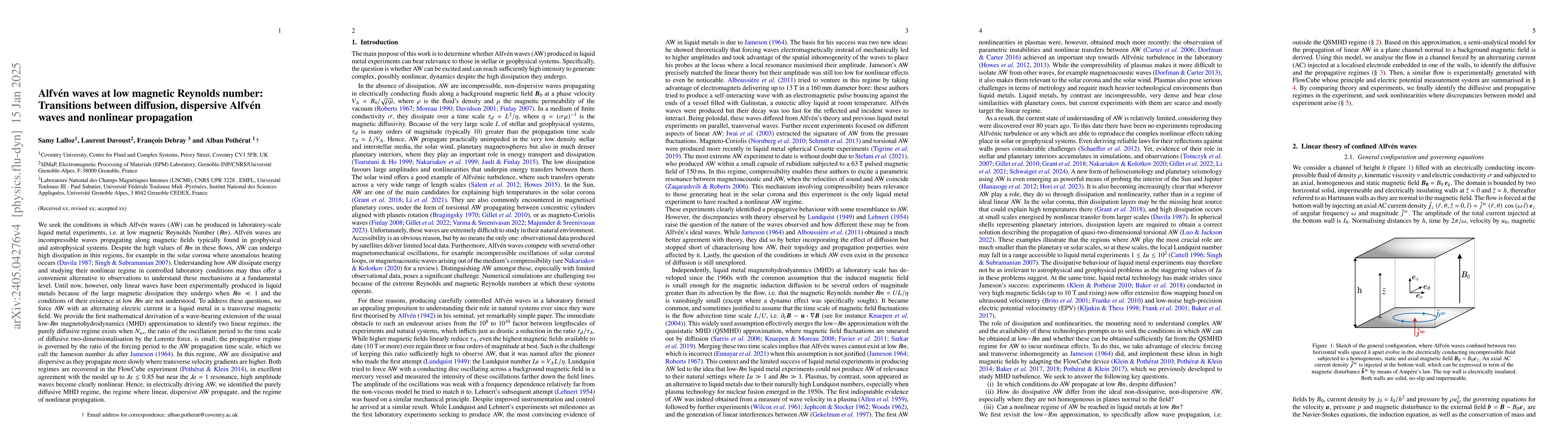 This paper investigates the production of Alfvén waves in low-magnetic Reynolds number conditions using laboratory-scale liquid metal experiments, identifying two linear regimes: the purely diffusive regime and the propagative regime governed by the Jameson number. The FLOWCUBE experiment successfully reproduces these regimes, showing agreement with the model until near the Jameson number of 1, where nonlinear wave behavior emerges.