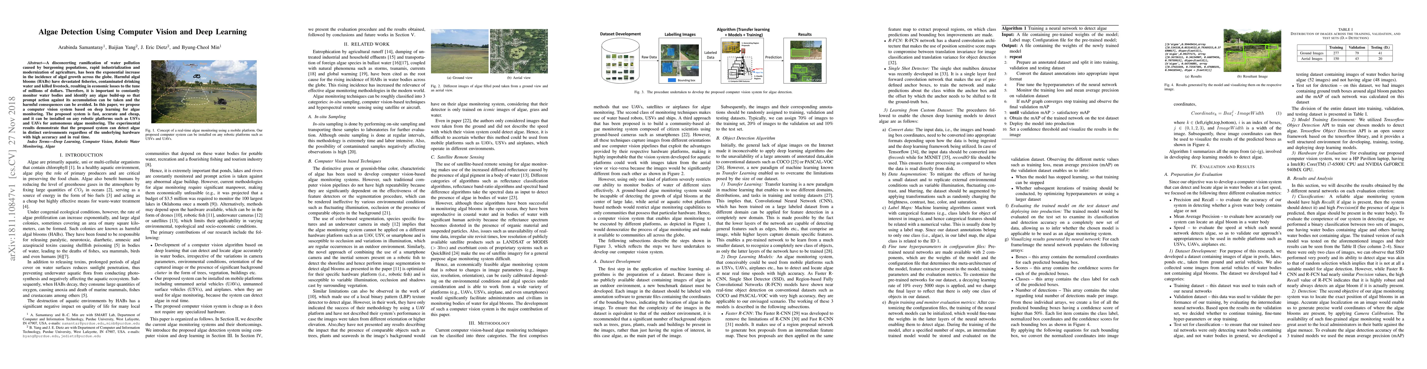 This paper proposes a computer vision system using deep learning to monitor and detect harmful algal blooms in water bodies. The system is designed to be fast, accurate, and cost-effective, enabling autonomous monitoring via robotic platforms like USVs and UAVs.