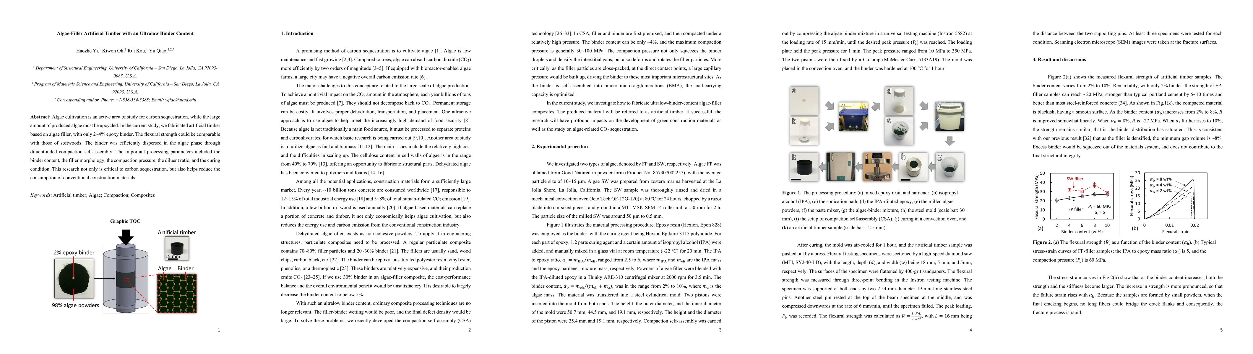 Algae cultivation is an active area of study for carbon sequestration, while the large amount of produced algae must be upcycled. In the current study, we fabricated artificial timber based on algae filler, with only 2~4% epoxy binder. The flexural strength could be comparable with those of softwoods. The binder was efficiently dispersed in the algae phase through diluent-aided compaction self-assembly. The important processing parameters included the binder content, the filler morphology, the compaction pressure, the diluent ratio, and the curing condition. This research not only is critical to carbon sequestration, but also helps reduce the consumption of conventional construction materials.