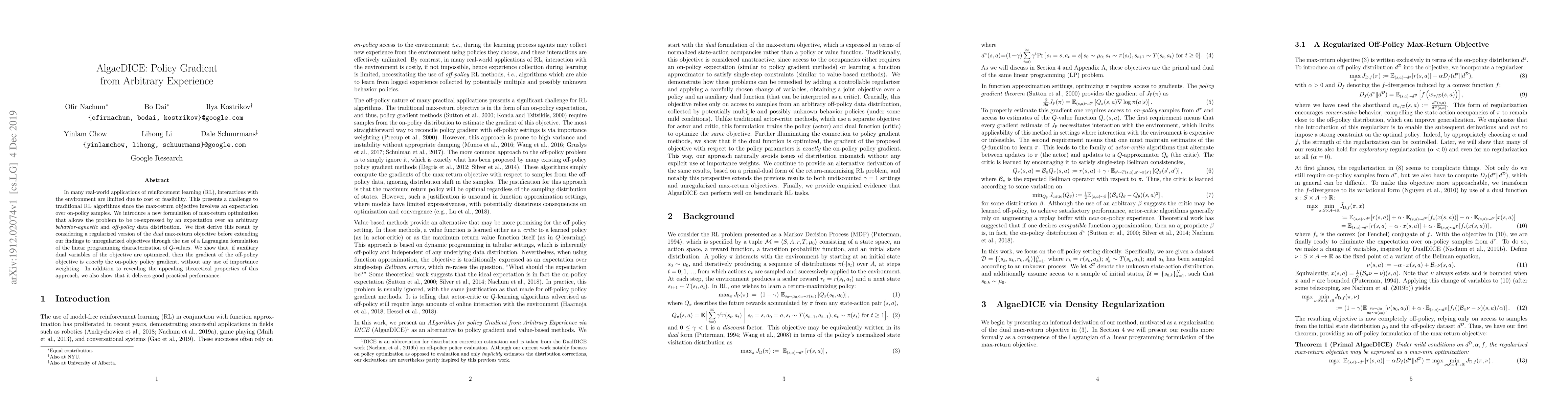 Researchers introduce a new approach to reinforcement learning called AlgaeDICE, which enables policy gradient estimation from arbitrary experience without the need for importance weighting or on-policy samples. This method provides theoretical benefits and practical performance.