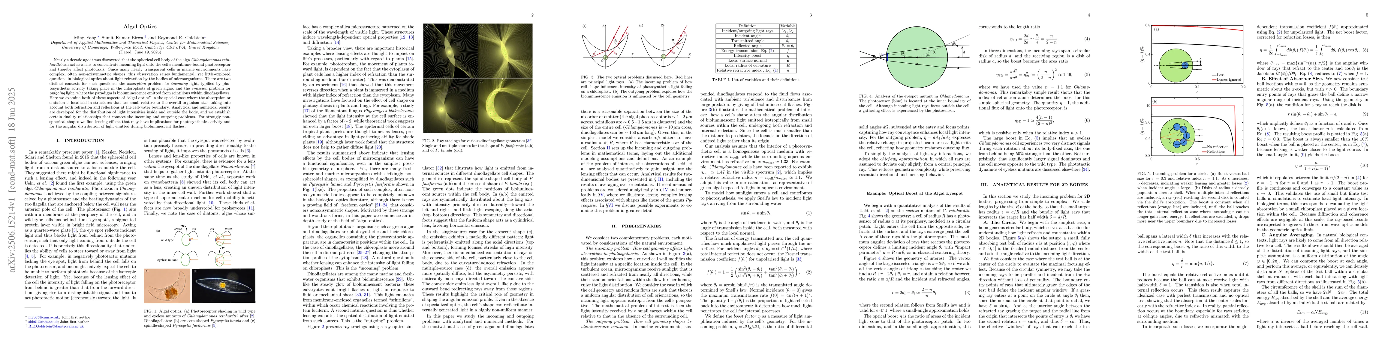 Nearly a decade ago it was discovered that the spherical cell body of the alga $Chlamydomonas~reinhardtii$ can act as a lens to concentrate incoming light onto the cell's membrane-bound photoreceptor and thereby affect phototaxis. Since many nearly transparent cells in marine environments have complex, often non-axisymmetric shapes, this observation raises fundamental, yet little-explored questions in biological optics about light refraction by the bodies of microorganisms. There are two distinct contexts for such questions: the $absorption$ problem for $incoming$ light, typified by photosynthetic activity taking place in the chloroplasts of green algae, and the $emission$ problem for $outgoing$ light, where the paradigm is bioluminescence emitted from scintillons within dinoflagellates. Here we examine both of these aspects of ``algal optics" in the special case where the absorption or emission is localized in structures that are small relative to the overall organism size, taking into account both refraction and reflections at the cell-water boundary. Analytical and numerical results are developed for the distribution of light intensities inside and outside the body, and we establish certain duality relationships that connect the incoming and outgoing problems. For strongly non-spherical shapes we find lensing effects that may have implications for photosynthetic activity and for the angular distribution of light emitted during bioluminescent flashes.