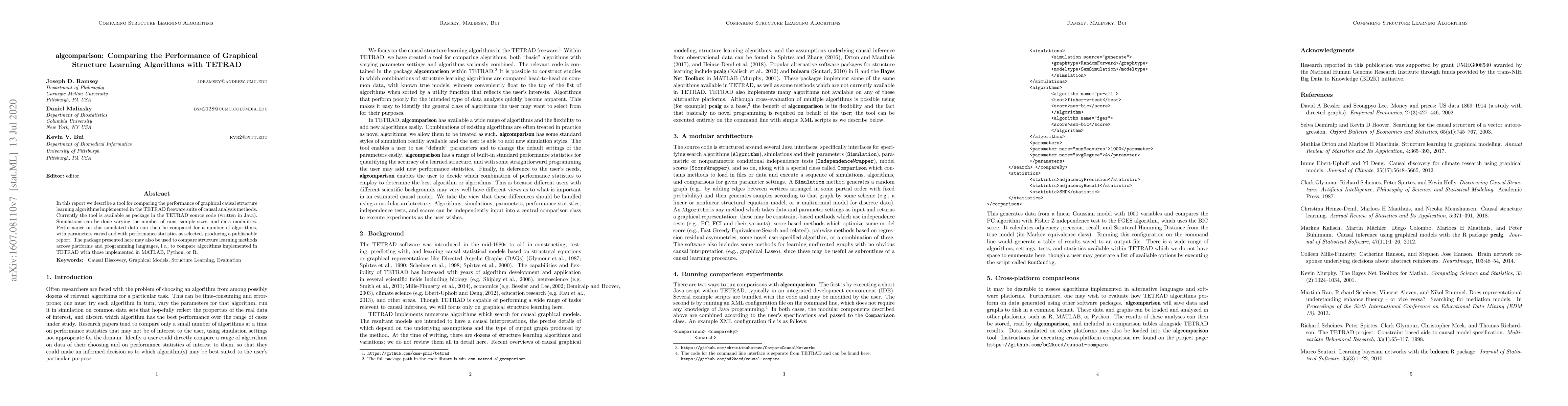 In this report we describe a tool for comparing the performance of graphical causal structure learning algorithms implemented in the TETRAD freeware suite of causal analysis methods. Currently the tool is available as package in the TETRAD source code (written in Java). Simulations can be done varying the number of runs, sample sizes, and data modalities. Performance on this simulated data can then be compared for a number of algorithms, with parameters varied and with performance statistics as selected, producing a publishable report. The package presented here may also be used to compare structure learning methods across platforms and programming languages, i.e., to compare algorithms implemented in TETRAD with those implemented in MATLAB, Python, or R.