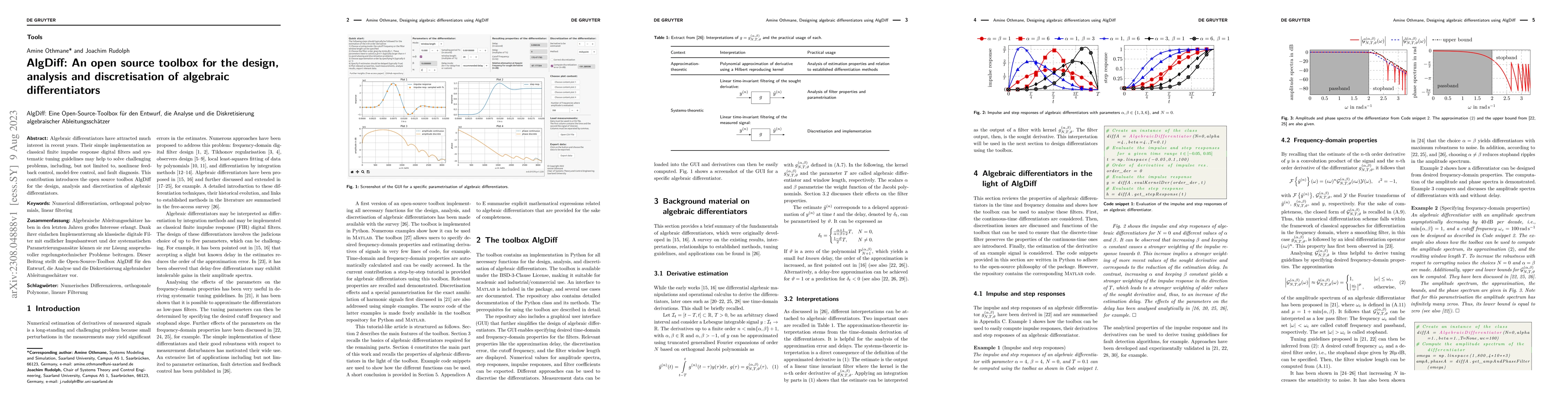 Summary: The paper introduces AlgDiff, an open-source toolbox for designing, analyzing, and discretizing algebraic differentiators, which can aid in solving complex problems like nonlinear feedback control and fault diagnosis. The toolbox provides systematic tuning guidelines and simple implementation as finite impulse response filters.