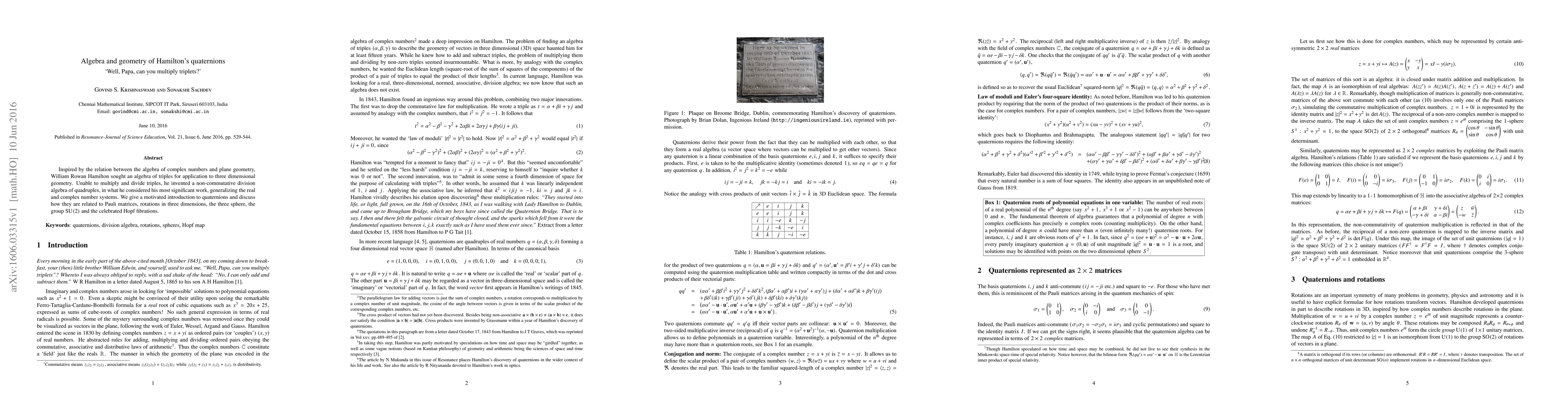 This paper introduces quaternions, Hamilton's non-commutative division algebra of quadruples, and explores their geometric applications, including connections to Pauli matrices, three-dimensional rotations, the three sphere, SU(2) group, and Hopf fibrations.