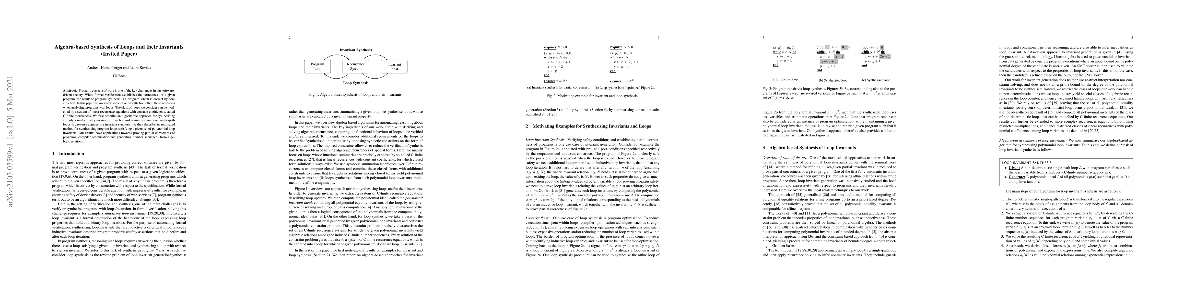 The paper presents algebra-based techniques for synthesizing loop invariants and loops, utilizing polynomial ideals and constraint solving over polynomials.
