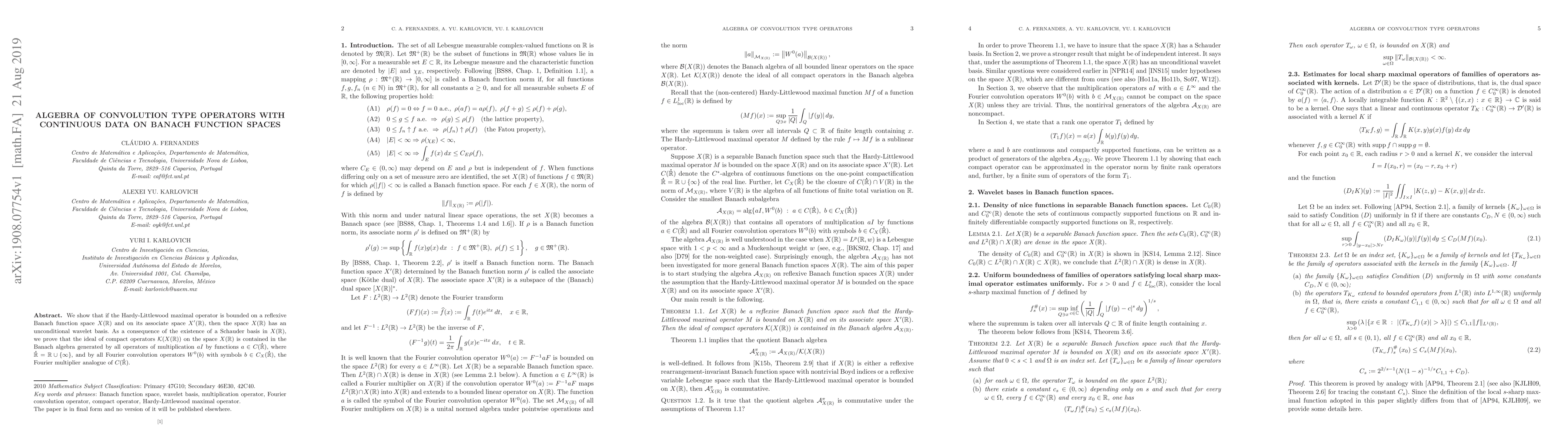 We show that if the Hardy-Littlewood maximal operator is bounded on a reflexive Banach function space $X(\mathbb{R})$ and on its associate space $X'(\mathbb{R})$, then the space $X(\mathbb{R})$ has an unconditional wavelet basis. As a consequence of the existence of a Schauder basis in $X(\mathbb{R})$, we prove that the ideal of compact operators $\mathcal{K}(X(\mathbb{R}))$ on the space $X(\mathbb{R})$ is contained in the Banach algebra generated by all operators of multiplication $aI$ by functions $a\in C(\dot{\mathbb{R}})$, where $\dot{\mathbb{R}}=\mathbb{R}\cup\{\infty\}$, and by all Fourier convolution operators $W^0(b)$ with symbols $b\in C_X(\dot{\mathbb{R}})$, the Fourier multiplier analogue of $C(\dot{\mathbb{R}})$.