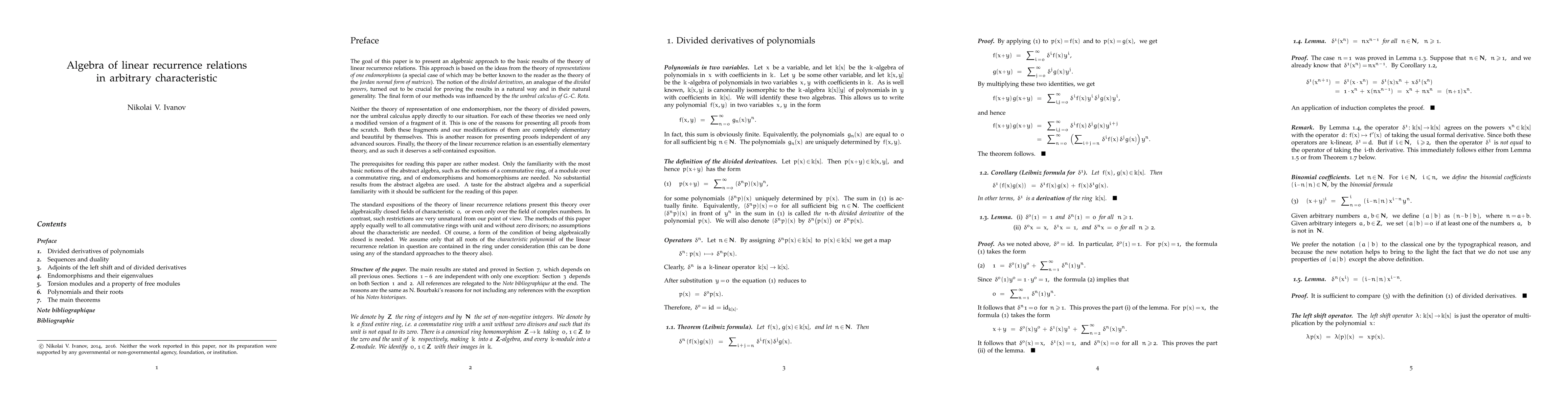 Researchers develop an algebraic approach to studying linear recurrence relations, using divided derivatives and influenced by umbral calculus, to achieve a general method that applies to arbitrary characteristic.