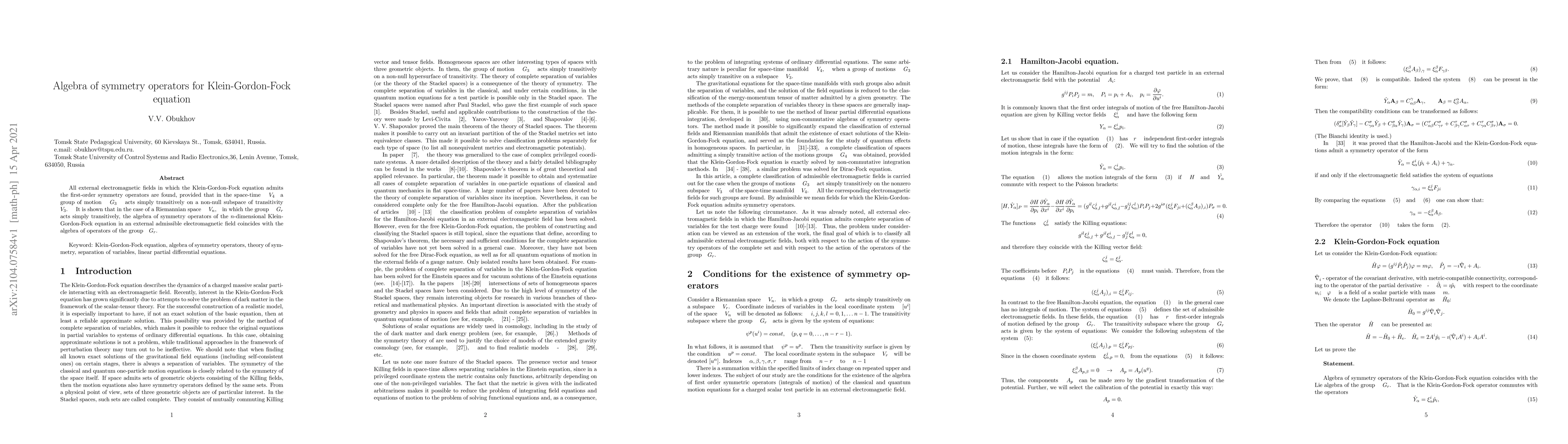 Research finds that in certain external electromagnetic fields, the algebra of symmetry operators for the Klein-Gordon-Fock equation coincides with the group's operator algebra when the space allows for simple transitive action by a group of motion.