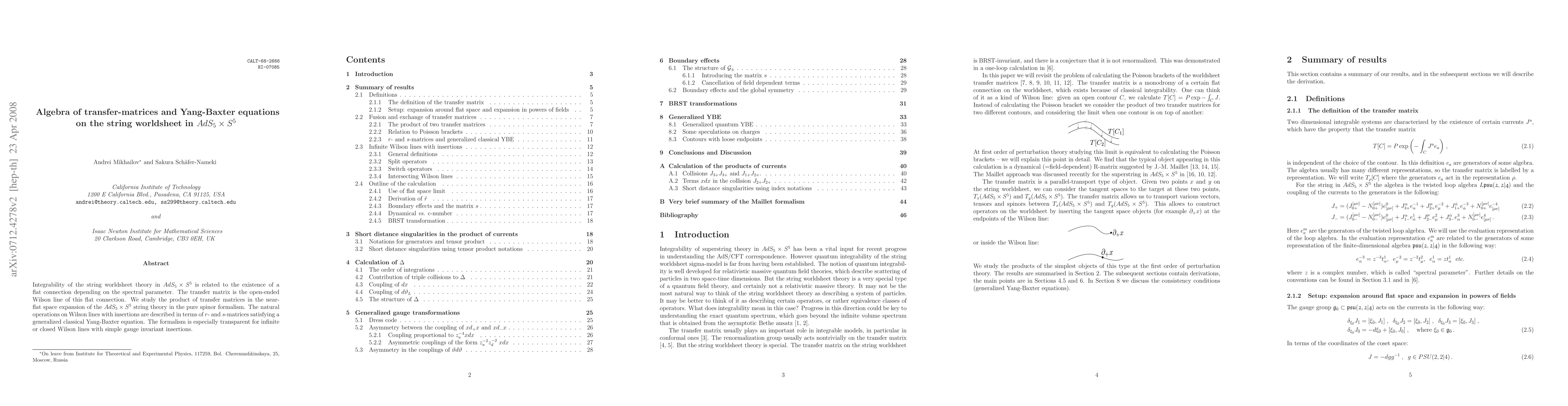This paper explores the integrability of string theory in AdS(5) x S(5) through the algebra of transfer matrices, which are open-ended Wilson lines of a flat connection. It introduces r- and s-matrices satisfying a generalized Yang-Baxter equation to describe operations on Wilson lines, providing a clear framework for infinite or closed Wilson lines with gauge-invariant insertions.