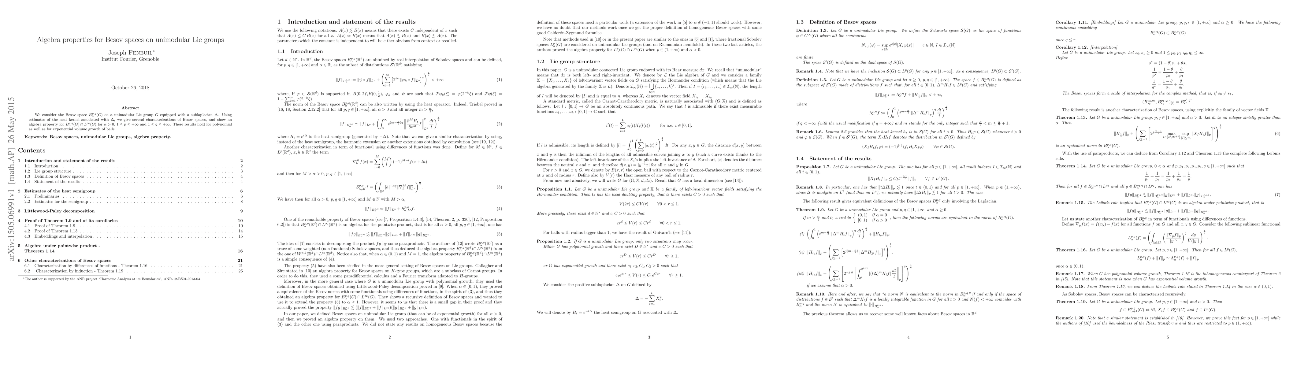 This paper explores Besov spaces $B^{p,q}_\alpha(G)$ on unimodular Lie groups $G$ with a sublaplacian $\Delta$, providing several characterizations via heat kernel estimates. It establishes an algebra property for $B^{p,q}_\alpha(G) \cap L^\infty(G)$ under specified conditions, valid for both polynomial and exponential volume growth scenarios.