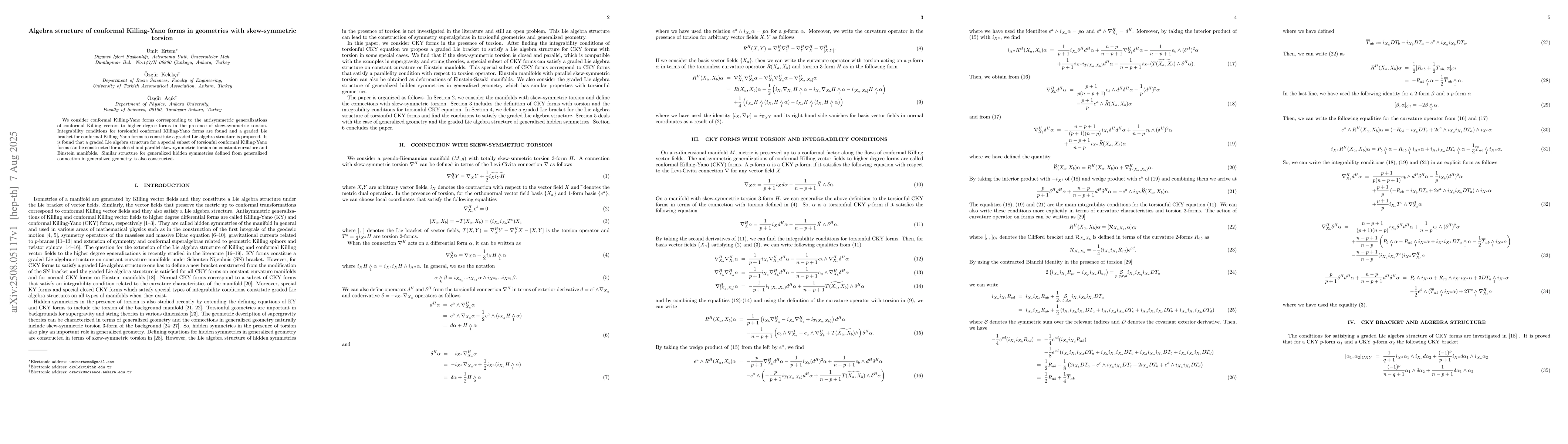 We consider conformal Killing-Yano forms corresponding to the antisymmetric generalizations of conformal Killing vectors to higher degree forms in the presence of skew-symmetric torsion. Integrability conditions for torsionful conformal Killing-Yano forms are found and a graded Lie bracket for conformal Killing-Yano forms to constitute a graded Lie algebra structure is proposed. It is found that a graded Lie algebra structure for a special subset of torsionful conformal Killing-Yano forms can be constructed for a closed and parallel skew-symmetric torsion on constant curvature and Einstein manifolds. Similar structure for generalized hidden symmetries defined from generalized connection in generalized geometry is also constructed.