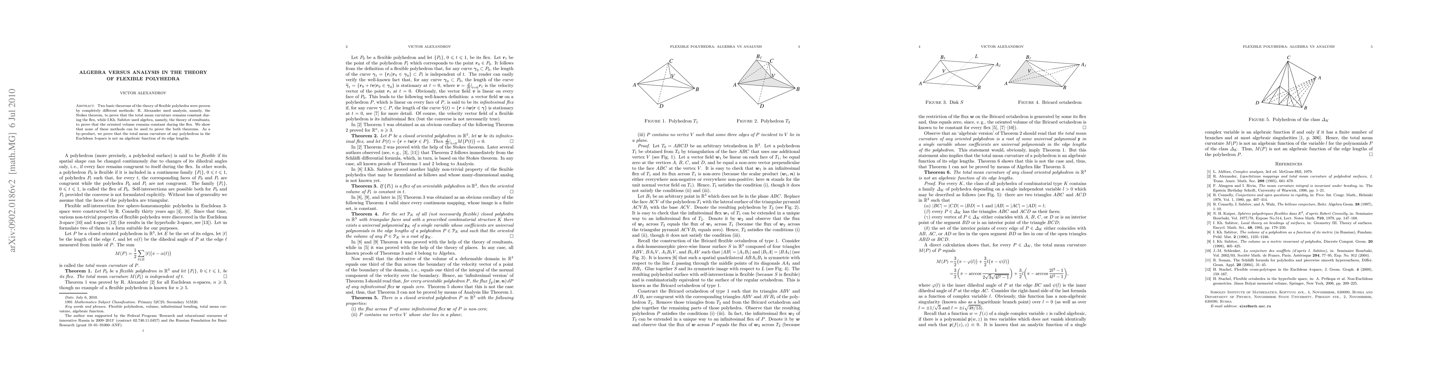 Two basic theorems of the theory of flexible polyhedra were proven by completely different methods: R. Alexander used analysis, namely, the Stokes theorem, to prove that the total mean curvature remains constant during the flex, while I.Kh. Sabitov used algebra, namely, the theory of resultants, to prove that the oriented volume remains constant during the flex. We show that none of these methods can be used to prove the both theorems. As a by-product, we prove that the total mean curvature of any polyhedron in the Euclidean 3-space is not an algebraic function of its edge lengths.