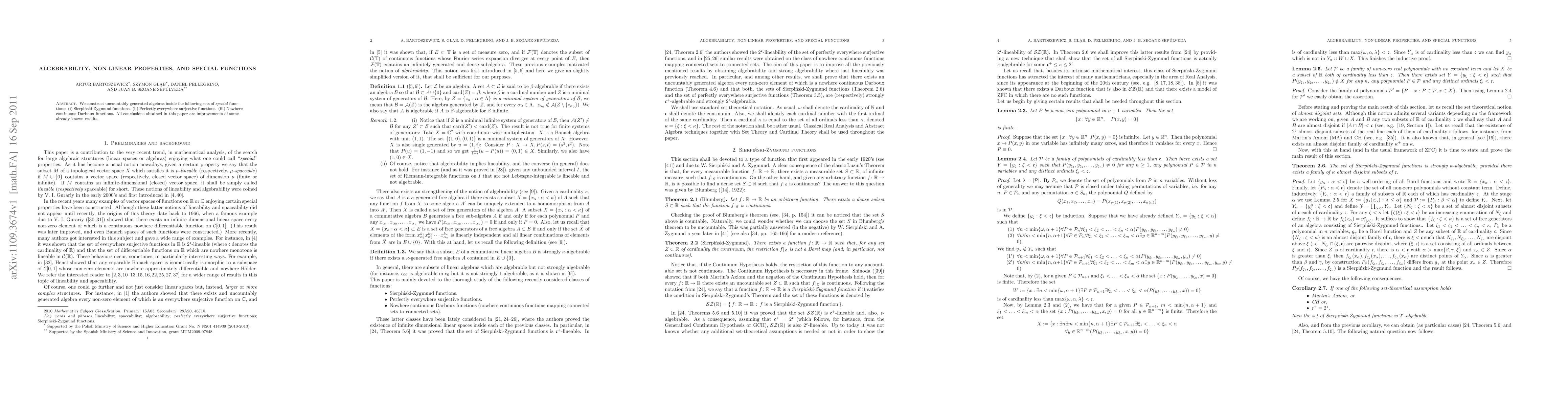 This paper constructs uncountably generated algebras within sets of special functions, including Sierpi\'nski-Zygmund, perfectly everywhere surjective, and nowhere continuous Darboux functions, thereby improving upon existing results in algebrability and non-linear properties.