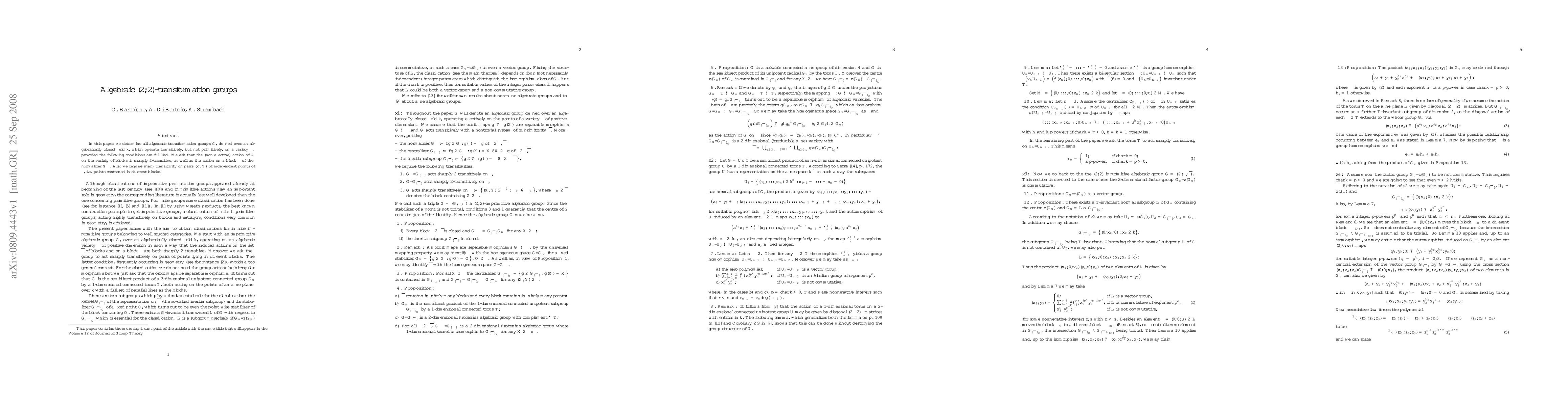 This paper contains the more significant part of the article with the same title that will appear in the Volume 12 of Journal of Group Theory (2009). In this paper we determine all algebraic transformation groups $G$, defined over an algebraically closed field $\sf k$, which operate transitively, but not primitively, on a variety $\Omega$, provided the following conditions are fulfilled. We ask that the (non-effective) action of $G$ on the variety of blocks is sharply 2-transitive, as well as the action on a block $\Delta$ of the normalizer $G_\Delta$. Also we require sharp transitivity on pairs $(X,Y)$ of independent points of $\Omega$, i.e. points contained in different blocks.