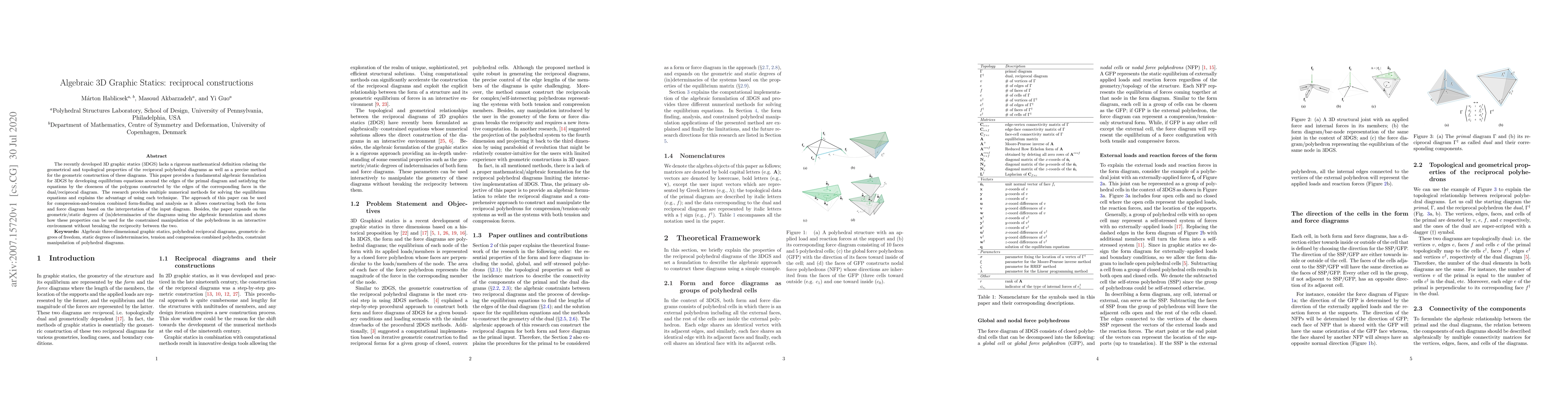 This paper introduces an algebraic framework for 3D graphic statics, providing equilibrium equations and methods for constructing reciprocal polyhedral diagrams, and discusses the geometric and static degrees of indeterminacies for manipulating these diagrams interactively while maintaining reciprocity.