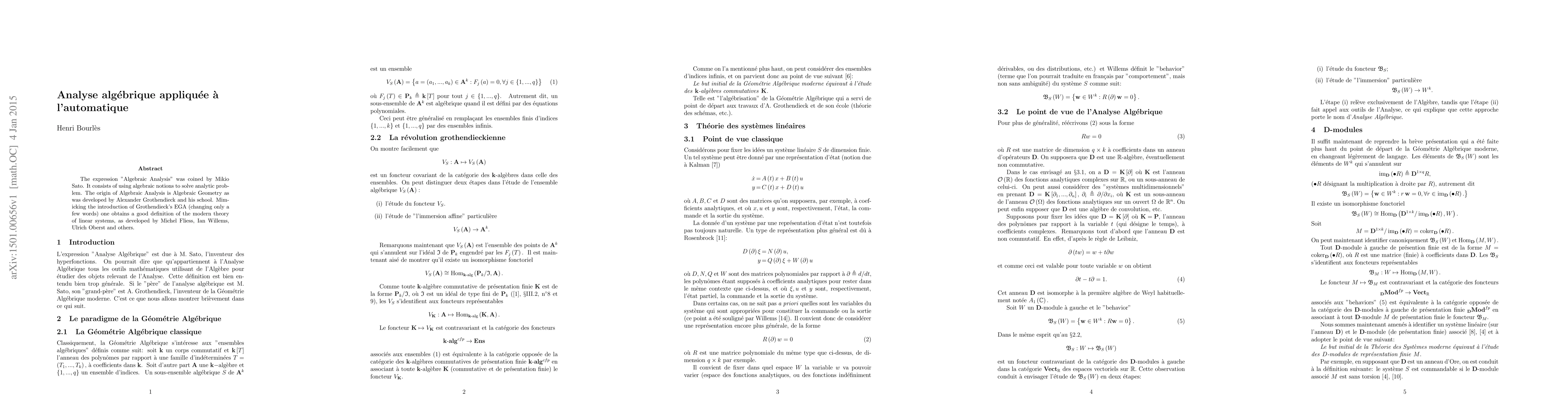 The expression "Algebraic Analysis" was coined by Mikio Sato. It consists of using algebraic notions to solve analytic problem. The origin of Algebraic Analysis is Algebraic Geometry as was developed by Alexander Grothendieck and his school. Mimicking the introduction of Grothendieck's EGA (changing only a few words) one obtains a good definition of the modern theory of linear dynamical systems, as developed by Michel Fliess, Ian Willems, Ulrich Oberst and others.