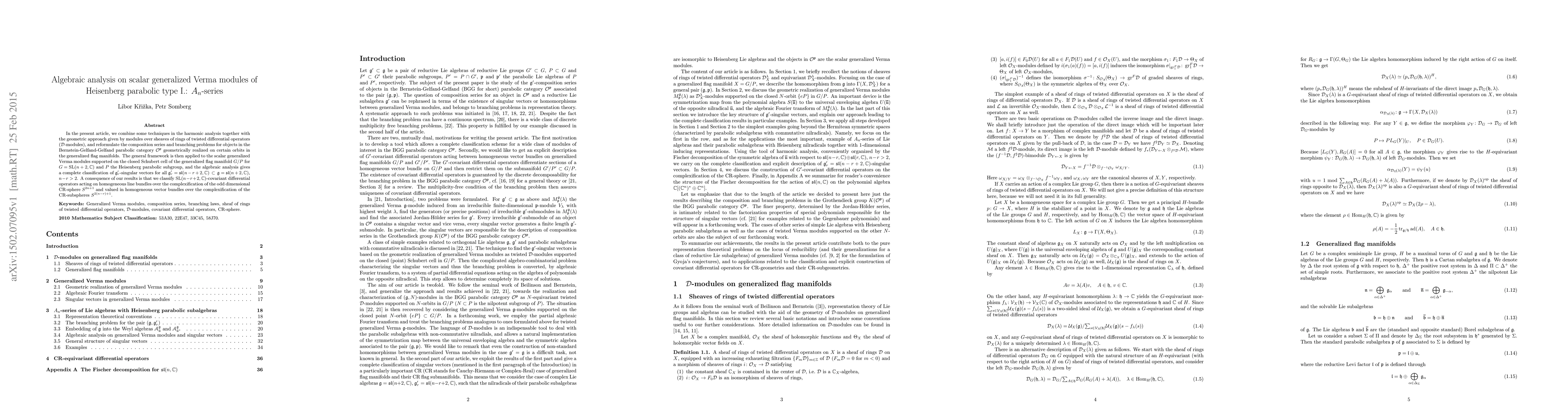 In the present article, we combine some techniques in the harmonic analysis together with the geometric approach given by modules over sheaves of rings of twisted differential operators ($\mathcal{D}$-modules), and reformulate the composition series and branching problems for objects in the Bernstein-Gelfand-Gelfand parabolic category $\mathcal{O}^\mathfrak{p}$ geometrically realized on certain orbits in the generalized flag manifolds. The general framework is then applied to the scalar generalized Verma modules supported on the closed Schubert cell of the generalized flag manifold $G/P$ for $G={\rm SL}(n+2,\mathbb{C})$ and $P$ the Heisenberg parabolic subgroup, and the algebraic analysis gives a complete classification of $\mathfrak{g}'_r$-singular vectors for all $\mathfrak{g}'_r=\mathfrak{sl}(n-r+2,\mathbb{C})\,\subset\, \mathfrak{g}=\mathfrak{sl}(n+2,\mathbb{C})$, $n-r > 2$. A consequence of our results is that we classify ${\rm SL}(n-r+2,\mathbb{C})$-covariant differential operators acting on homogeneous line bundles over the complexification of the odd dimensional CR-sphere $S^{2n+1}$ and valued in homogeneous vector bundles over the complexification of the CR-subspheres $S^{2(n-r)+1}$.