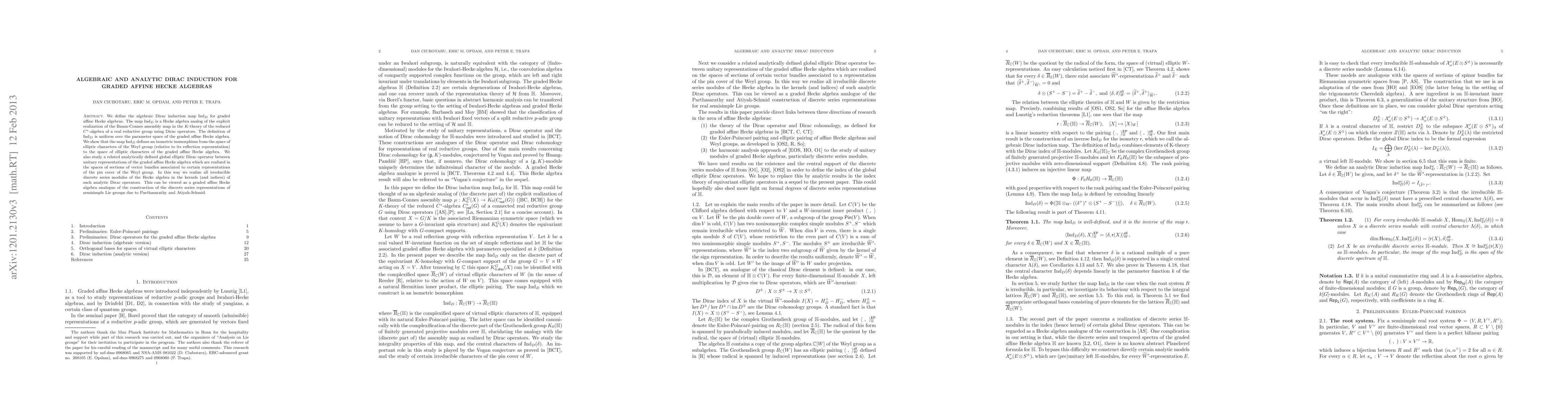 This paper defines algebraic Dirac induction for graded affine Hecke algebras, establishing an isometric isomorphism between character spaces. It also introduces an analytic global elliptic Dirac operator, realizing all irreducible discrete series modules within its kernels, akin to the construction for semisimple Lie groups.