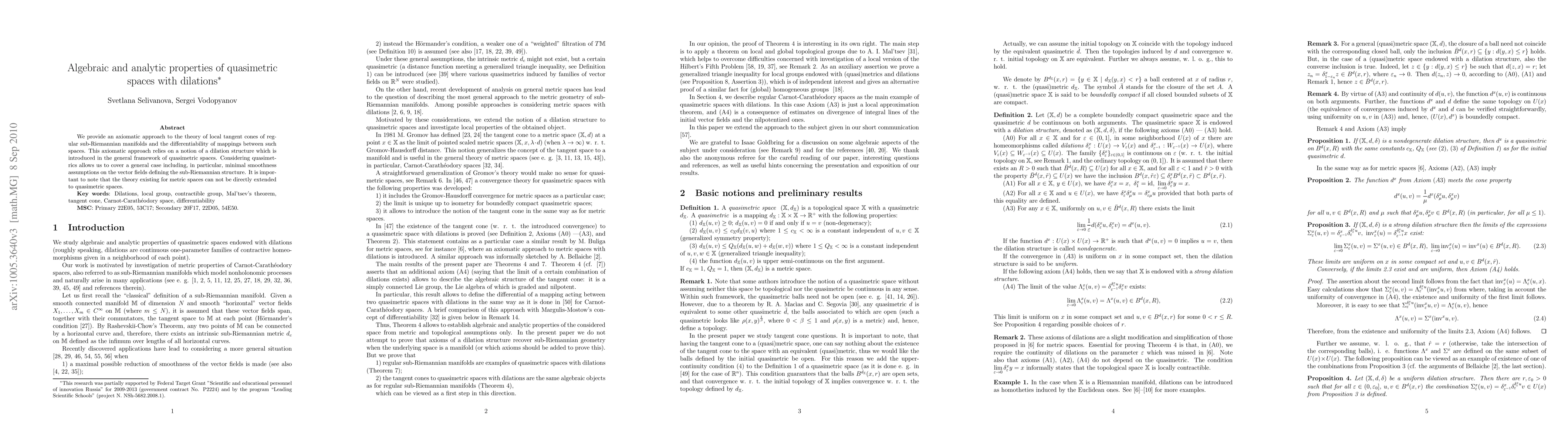 We provide an axiomatic approach to the theory of local tangent cones of regular sub-Riemannian manifolds and the differentiability of mappings between such spaces. This axiomatic approach relies on a notion of a dilation structure which is introduced in the general framework of quasimetric spaces. Considering quasimetrics allows us to cover a general case including, in particular, minimal smoothness assumptions on the vector fields defining the sub-Riemannian structure. It is important to note that the theory existing for metric spaces can not be directly extended to quasimetric spaces.