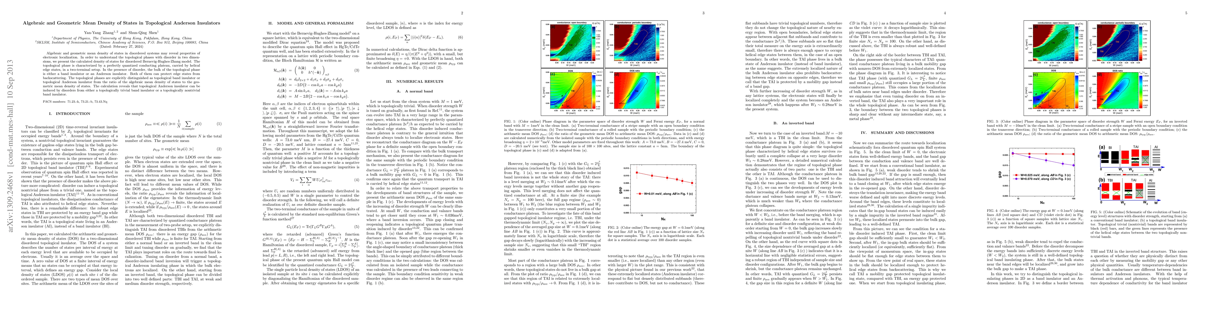 Algebraic and geometric mean density of states in disordered systems may reveal properties of electronic localization. In order to understand the topological phases with disorder in two dimensions, we present the calculated density of states for disordered Bernevig-Hughes-Zhang model. The topological phase is characterized by a perfectly quantized conducting plateau, carried by helical edge states, in a two-terminal setup. In the presence of disorder, the bulk of the topological phase is either a band insulator or an Anderson insulator. Both of them can protect edge states from backscattering. The topological phases are explicitly distinguished as topological band insulator or topological Anderson insulator from the ratio of the algebraic mean density of states to the geometric mean density of states. The calculation reveals that topological Anderson insulator can be induced by disorders from either a topologically trivial band insulator or a topologically nontrivial band insulator.