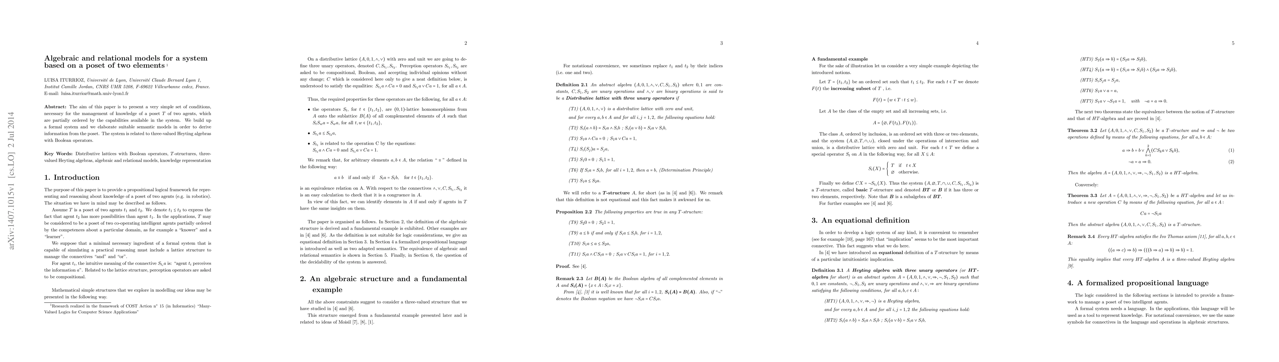 The aim of this paper is to present a very simple set of conditions, necessary for the management of knowledge of a poset $T$ of two agents, which are partially ordered by the capabilities available in the system. We build up a formal system and we elaborate suitable semantic models in order to derive information from the poset. The system is related to three-valued Heyting algebras with Boolean operators.