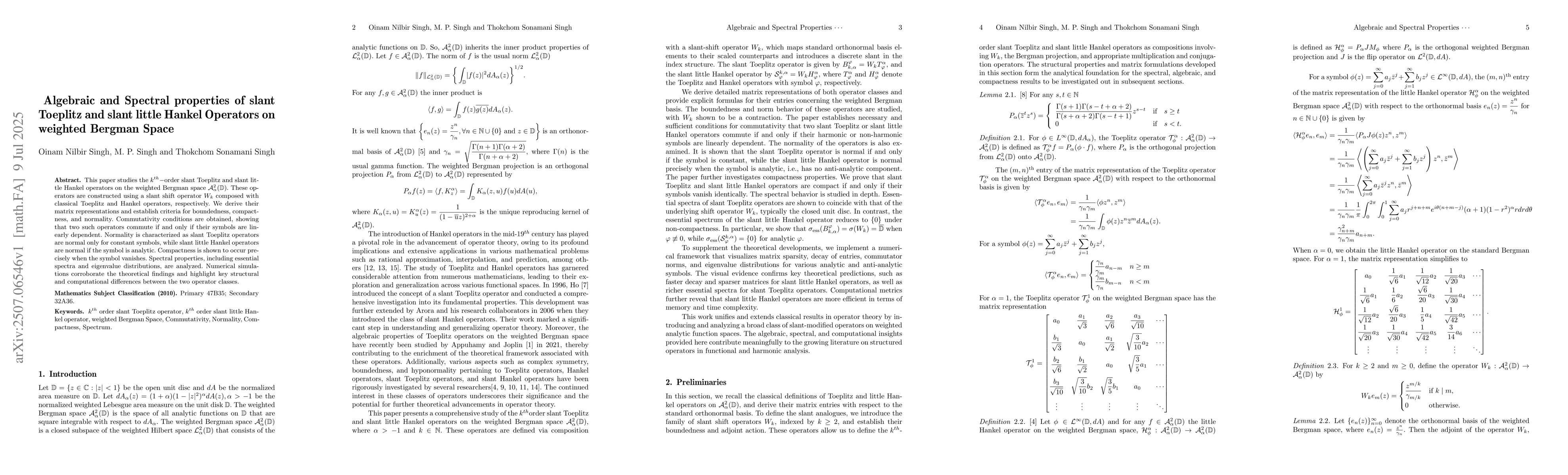 This paper studies the \(k^{th}-\)order slant Toeplitz and slant little Hankel operators on the weighted Bergman space \(\mathcal{A}_\alpha^2(\mathbb{D})\). These operators are constructed using a slant shift operator \(W_k\) composed with classical Toeplitz and Hankel operators, respectively. We derive their matrix representations and establish criteria for boundedness, compactness, and normality. Commutativity conditions are obtained, showing that two such operators commute if and only if their symbols are linearly dependent. Normality is characterized as slant Toeplitz operators are normal only for constant symbols, while slant little Hankel operators are normal if the symbol is analytic. Compactness is shown to occur precisely when the symbol vanishes. Spectral properties, including essential spectra and eigenvalue distributions, are analyzed. Numerical simulations corroborate the theoretical findings and highlight key structural and computational differences between the two operator classes.