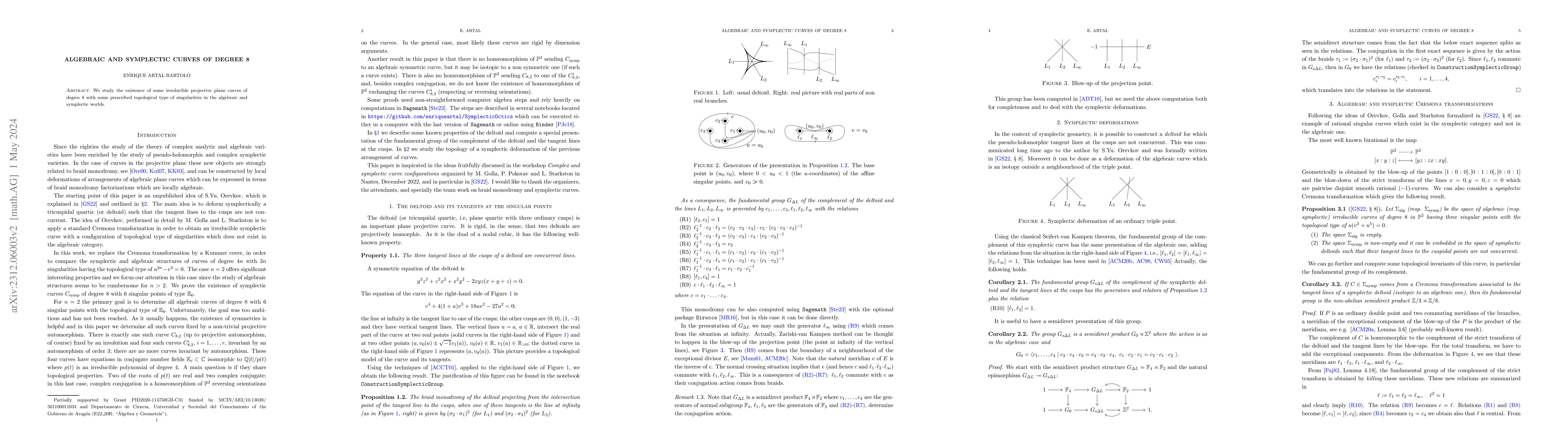 This paper investigates irreducible projective plane curves of degree 8 that possess specific types of singularities in both algebraic and symplectic settings. The focus is on their existence and topological characteristics.