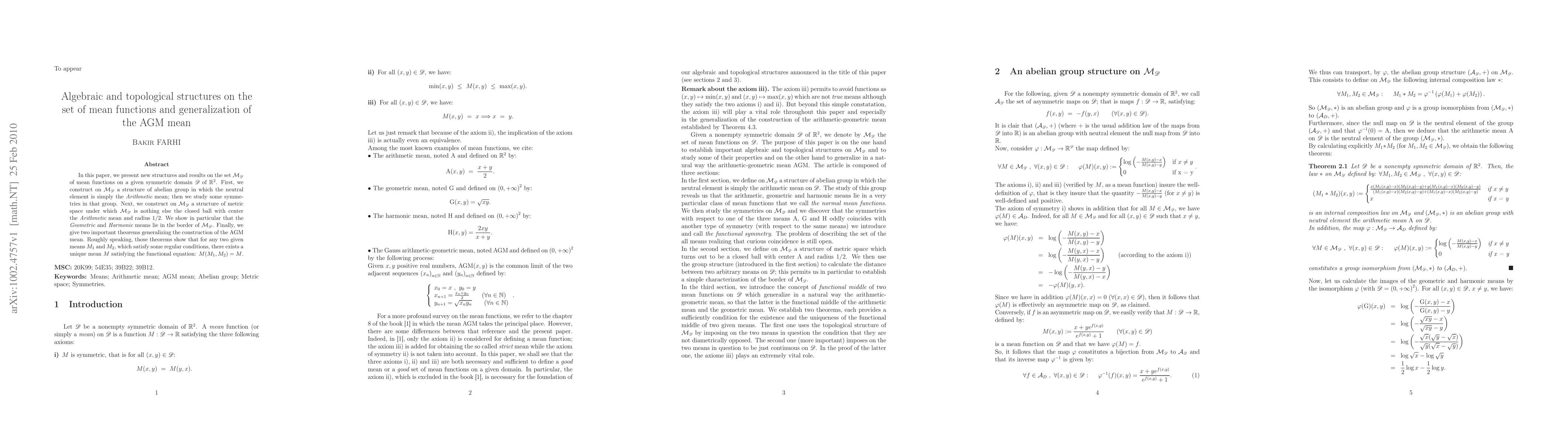 In this paper, we present new structures and results on the set $\M_\D$ of mean functions on a given symmetric domain $\D$ of $\mathbb{R}^2$. First, we construct on $\M_\D$ a structure of abelian group in which the neutral element is simply the {\it Arithmetic} mean; then we study some symmetries in that group. Next, we construct on $\M_\D$ a structure of metric space under which $\M_\D$ is nothing else the closed ball with center the {\it Arithmetic} mean and radius 1/2. We show in particular that the {\it Geometric} and {\it Harmonic} means lie in the border of $\M_\D$. Finally, we give two important theorems generalizing the construction of the $\AGM$ mean. Roughly speaking, those theorems show that for any two given means $M_1$ and $M_2$, which satisfy some regular conditions, there exists a unique mean $M$ satisfying the functional equation: $M(M_1, M_2) = M$.