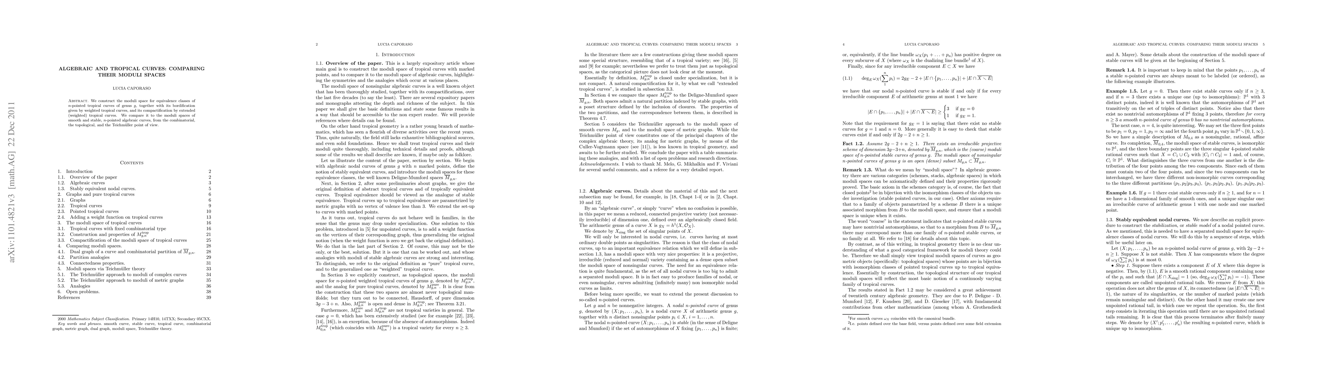 This paper constructs and compactifies the moduli space for tropical curves, then compares it to moduli spaces of algebraic curves from combinatorial, topological, and Teichmüller perspectives. The work is expository and extends previous results from a related preprint.