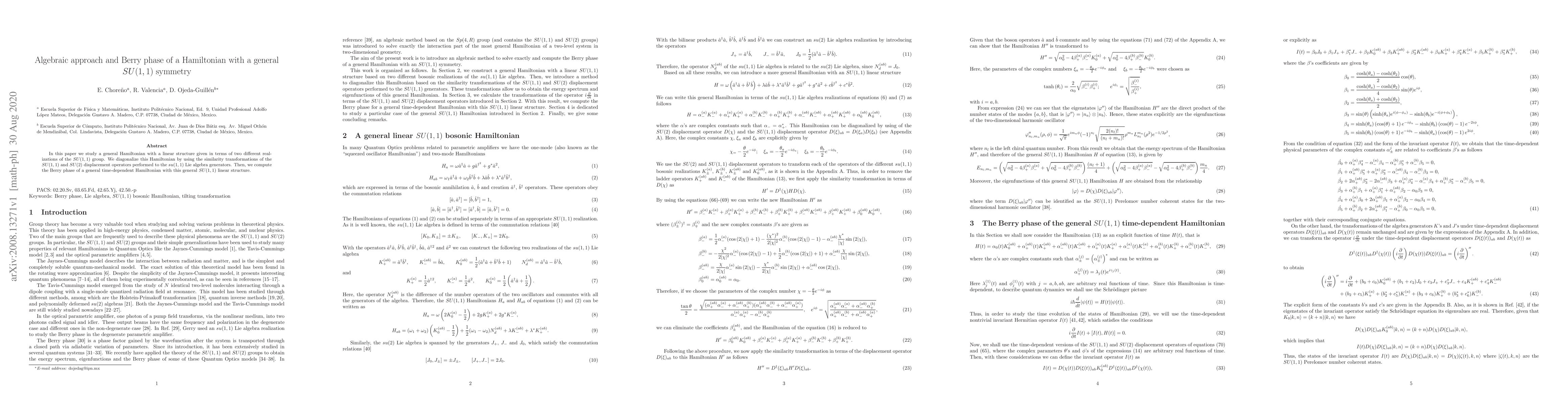 This paper uses $SU(1,1)$ symmetry to study a general Hamiltonian, diagonalizing it using displacement operators and computing the Berry phase of a time-dependent Hamiltonian with this structure.