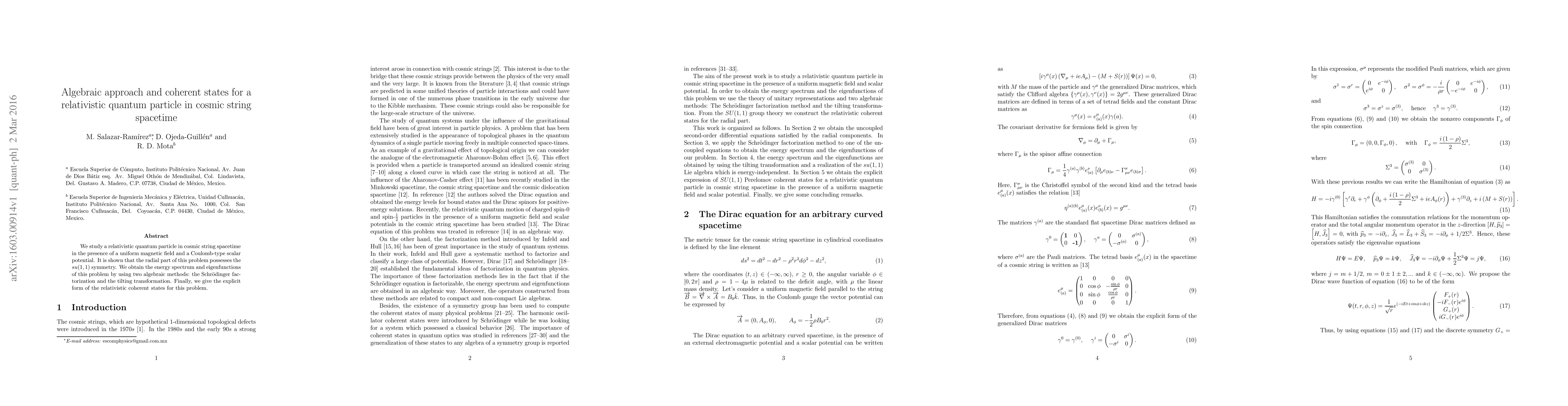We study a relativistic quantum particle in cosmic string spacetime in the presence of a uniform magnetic field and a Coulomb-type scalar potential. It is shown that the radial part of this problem possesses the $su(1,1)$ symmetry. We obtain the energy spectrum and eigenfunctions of this problem by using two algebraic methods: the Schr\"odinger factorization and the tilting transformation. Finally, we give the explicit form of the relativistic coherent states for this problem.