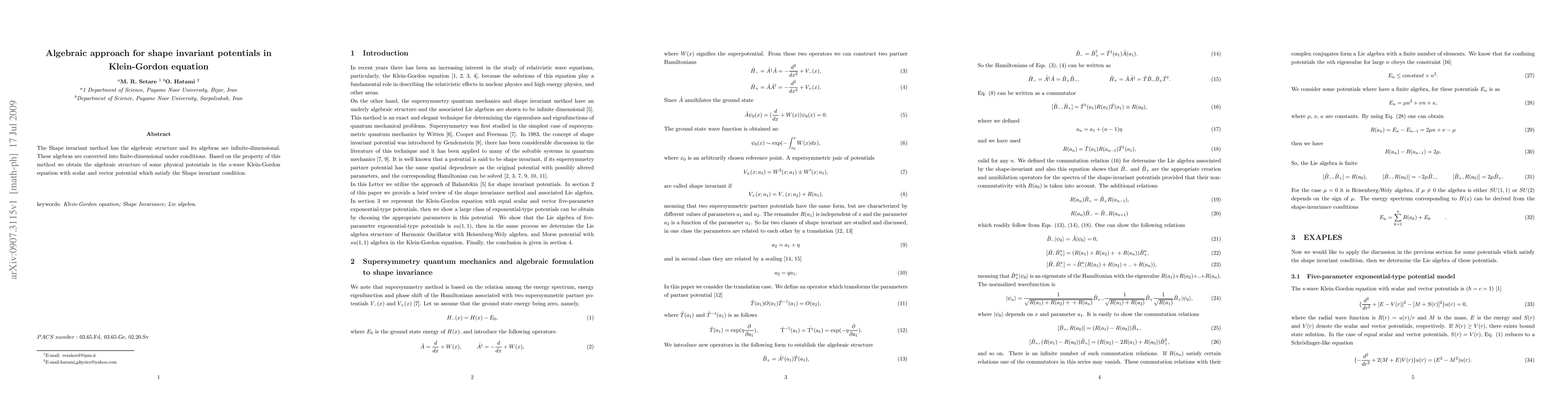 The Shape invariant method has the algebraic structure and its algebras are infinite-dimensional. These algebras are converted into finite-dimensional under conditions. Based on the property of this method we obtain the algebraic structure of some physical potentials in the s-wave Klein-Gordon equation with scalar and vector potential which satisfy the Shape invariant condition.